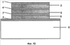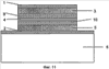 На фиг.10 представлен пример выполнения акустического резонатора, состоящего из верхнего и нижнего внешних электродов 1 и 2, являющихся соответственно СВЧ входом и выходом резонатора, первого сегнетоэлектрического слоя 3, а также двух дополнительных электродов 4, 7 и двух дополнительных слоев сегнетоэлектрика 5, 8. Нижний электрод 2 располагается на диэлектрической подложке 6. Сегнетоэлектрик дополнительных слоев может находиться как в парафазе, так и в сегнетофазе, отличие заключается лишь в том, что в первом случае постоянное напряжение смещения сохраняется на электродах в течение всего периода работы резонатора, а во втором – может быть снято после переключения знака пьезомодуля, т.к. в сегнетоэлектрическом состоянии пьезоэффект возможен и в отсутствие внешнего постоялого поля. Увеличение числа слоев сегнетоэлектрика существенно не меняет принцип действия резонатора, а позволяет за счет увеличения числа источников гиперзвука дополнительно управлять амплитудой стоячих воли, т.е. менять эффективность возбуждения каждой собственной моды.