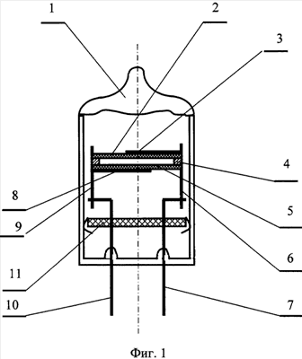 Первый 2 и второй 5 кристаллические элементы жестко укреплены на элементах токопроводящего держателя 6 и 9, например, путем пайки к пятнам возженного серебра, размещенного на торцах и плоскостях кристаллических элементов 2 и 5. Второй электрод 8 нанесен на втором кристаллическом элементе 5 и через токопроводящие элементы держателя 9 электрически соединен с выводом 10 резонатора. Для устранения перекосов проволочных держателей 6 и 9 при монтаже резонатора, для обеспечения механической прочности конструкции и для защиты пьезоэлементов от пламени огневой заварки, используемой при герметизации стеклянного баллона 1, смонтировано основание 11.