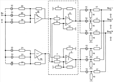 Таким образом, если частоты пьезорезонаторов 12 и 14 равны fi, а частоты пьезорезонаторов 13 и 15 равны fk, фильтр в целом будет представлять собой каскадное включение гребенчатого фильтра и однозвенного фильтра, полоса пропускания которого совпадает с одним из лепестков АЧХ гребенчатого. Поскольку пьезорезонаторы первой группы (а также и второй) развязаны между собой через резисторы 20, их частотный промежуток не изменится и полоса пропускания каждого канала будет примерно равна удвоенному частотному промежутку используемых пьезорезонаторов независимо от числа каналов.
