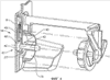 На фиг.1 показан вид в перспективе раздаточного устройства согласно первому варианту осуществления изобретения. В последующем тексте термины «внутренний» и «наружный» используются для обозначения положения компонентов относительно задней секции R, если иное не указано. Задняя секция R предназначена для установки на стену или аналогичную вертикальную, или близкую к вертикальной поверхность. В примерах, описанных ниже, рулоны размещены в раздаточном устройстве с осями, расположенными по существу под прямыми углами к задней секции R установленного на стене раздаточного устройства. Раздаточное устройство, прежде всего, предназначено для рулонов без сердечника, имеющих центральное шпиндельное средство S1, S2, вставленное в концы рулона и продолжающееся наружу по оси за пределы концов рулона. Раздаточное устройство содержит крышку (указанную штрихпунктирной линией) с передней поверхностью 2, верхней поверхностью 3 и парой боковых поверхностей 4, 5. Крышка 1 открывается отгибанием всей крышки вперед, из положения указанного штрихпунктирными линиями, и вниз в показанное положение. Крышка 1 поворачивается вокруг пары шарниров 6, 7, размещенных на нижнем краю соответствующих боковых поверхностей 4, 5 на обеих сторонах раздаточного устройства. Раздаточное устройство 1 установлено по существу на вертикальной поверхности посредством задней секции R. Средство T для разрывания располагается вокруг нижних краев раздаточного устройства, при этом средство T для разрывания прикреплено к нижнему краю рамы 8, установленной на задней секции R. Раздаточное устройство выполнено с возможностью приема двух рулонов A, B (указаны штрихпунктирной линией), которые вставляются сверху раздаточного устройства посредством размещения шпиндельного средства относительно сходящихся направляющих поверхностей 11, 12 в задней секции R и в раме 8, установленной на задней секции и продолжающейся наружу, чтобы по существу огибать рулоны A, B впереди раздаточного устройства. Рама 8 открыта сверху для предоставления возможности вставления рулонов и открыта внизу для предоставления возможности извлечения материала полотна. Направляющие пазы 14, 15 оборудованы в задней секции R и внутренней поверхности рамы 8, соответственно, для направления рулонов A, B с резервного положения 17 вниз через раздаточное устройство на раздаточное положение 16, как указано, посредством соответствующих шпинделей S1, S2 на фиг.1.