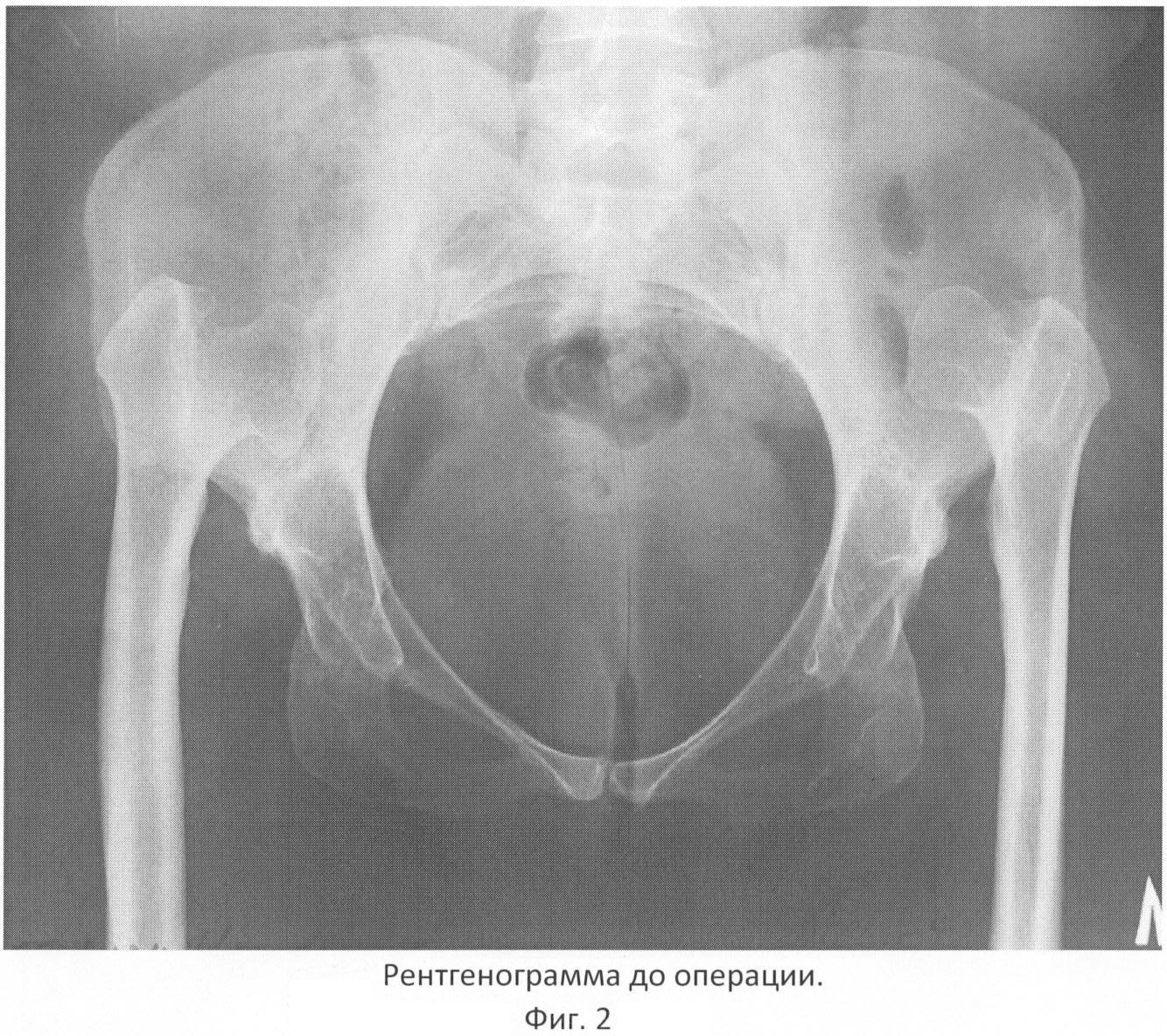 Больная И., 45 лет, в анамнезе – двусторонний врожденный вывих бедра, никакого лечения в детстве не проводилось. В последние несколько лет отметила изменение походки, появление боли в тазобедренных суставах в ночное время, усилилась боль в тазобедренных суставах, хромота. В последние 2 месяца наступило ухудшение состояния, связанное с резким усилением болевого синдрома, больная перестала ходить. При рентгенографии диагностирован двусторонний врожденный вывих бедер со значительным смещением головок бедренных костей кверху, дисплазией вертлужных впадин и бедренных костей. В течение месяца проводилось консервативное лечение в больнице – без эффекта. Поступила в ГВКГ им. акад. Н.Н.Бурденко для оперативного лечения. При поступлении – ходит без дополнительных средств опоры, с трудом переставляя ноги. Положительный симптом Тренделенбурга с обеих сторон. Отмечена гипермобильность тазобедренных суставов, резкая болезненность при движениях. На рентгенограммах: головки бедренных костей овальной формы, смещены кверху, образуя неоартроз с крыльями подвздошных костей, костномозговые каналы бедренных костей узкие, до 12 мм, недоразвитие истинных вертлужных впадин, диаметр их не более 36 мм, расстояние от головок бедренных костей до истинных вертлужных впадин 12 см (фиг.2).