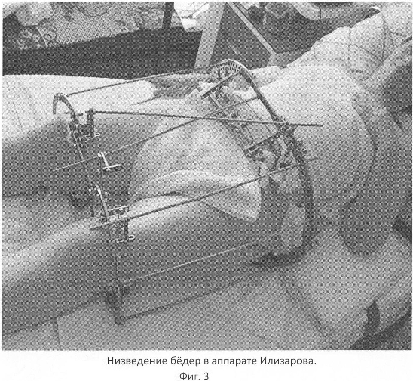 Задачей изобретения является повышение эффективности коррекции деформаций тазобедренных суставов в случаях тяжелой врожденной дисплазии обоих тазобедренных суставов с полным вывихом бедер и значительным смещением их вверх путем одномоментного их эндопротезирования после низведения бедер в аппарате Илизарова, исключить тракционное повреждение седалищного нерва и сосудов, уменьшить травматичность операции, сформировать капсулу тазобедренного сустава и восстановить функцию суставов с соответствующим изменением длины конечностей, а также сократить сроки реабилитации.