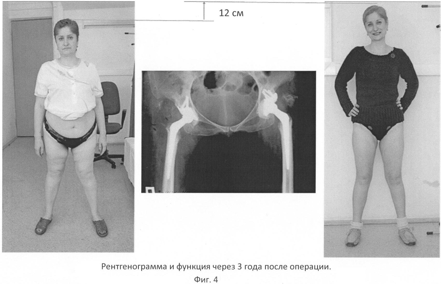 Оперировано по заявляемому способу 2 человека. Сроки наблюдения после операции составили от 6 месяцев до 3 лет. Получен хороший результат – рост больных увеличился на 12 см, движения в тазобедренных суставах в полном объеме, отсутствуют боль и хромота, ходят без помощи костылей и трости.