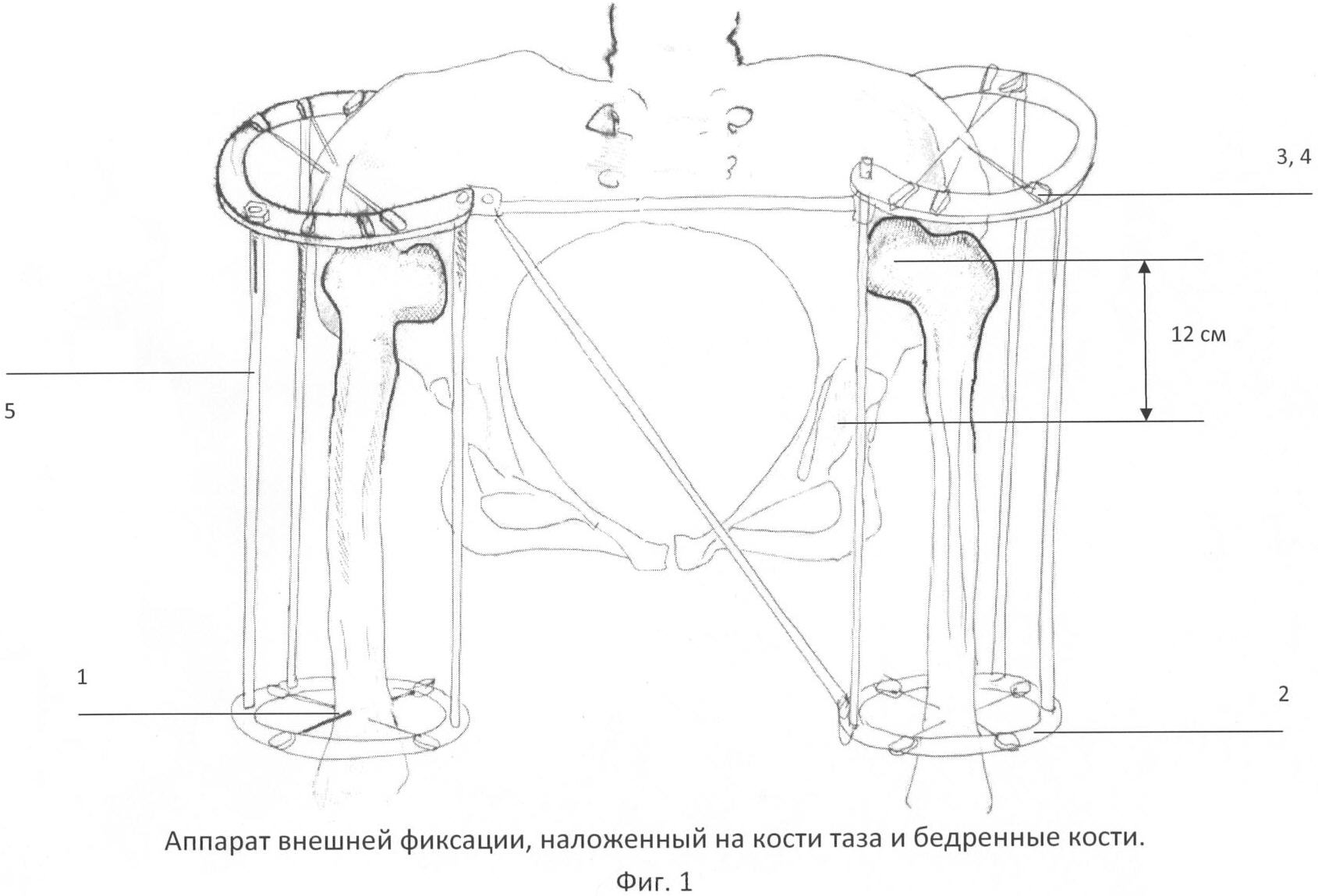 Сначала операцию выполняют под перидуральной анестезией на ортопедическом столе в положении больного на спине с фиксацией обеих конечностей на стоподержателях с противоупором в промежности. Накладывают аппарат внешней фиксации, например Илизарова (фиг.1), для чего проводят по 3 перекрещивающихся спицы (1) с напайками через передние и задние ости крыльев подвздошных костей и по 3 перекрещивающиеся спицы через нижнюю треть бедренных костей. Спицы фиксируют в дугах и кольцах (2) аппарата Илизарова с помощью спицефиксаторов (3) и выносных планок (4), кольца и дуги соединяют между собой резьбовыми штангами (5). Со вторых суток после операции начинают низведение бедренных костей путем дистракции в аппарате внешней фиксации, например Илизарова, по 1-2 мм в сутки в течение 6-8 недель, достаточных для достижения оптимального положения бедренных костей относительно вертлужной впадины. После этого аппарат Илизарова снимают, оставляя по 1 спице в нижней трети бедренных костей для поддержки достигнутой дистракции скелетным вытяжением, и по заживлении спицевых ран выполняют одноэтапное двустороннее эндопротезирование тазобедренных суставов, для чего операцию производят под общей анестезией в положении больного на спине на операционном столе. Переднелатеральным доступом послойно обнажают проксимальную часть бедренной кости, осциллирующей пилой резецируют головку бедренной кости, сферическими фрезами обрабатывают недоразвитую вертлужную впадину, устанавливают укрепляющее кольцо, например Мюллера, и фиксируют его спонгиозными винтами. Затем устанавливают чашку эндопротеза на костном цементе в положении наклона 45 градусов и антеверсии 10 градусов. В рану с помощью приведения и наружной ротации бедра выводят опил бедренной кости. Рашпилями обрабатывают костномозговой канал, в который плотно вбивают бесцементный бедренный компонент эндопротеза, например коническую ножку Вагнера, располагая шейку его в соответствии с углом антеверсии установленного вертлужного компонента. На шейку эндопротеза надевают металлическую головку необходимой длины. Производят вправление бедра путем тяги по оси конечности и внутренней ротации. После контроля объема движений в суставе и тщательного гемостаза формируют капсулу сустава из мягкотканного регенерата, образующегося при дистракции бедренной кости. Рану тампонируют салфетками для снижения кровотечения, накладывают 2-3 провизорных шва на кожу и выполняют аналогичную операцию на втором тазобедренном суставе. После этого удаляют тампоны со стороны первого восстановленного сустава, проводят контроль гемостаза и ушивают рану с оставлением на 48-72 часа 2-3 силиконовых дренажей. Подобным же образом ушивают рану с другой стороны.