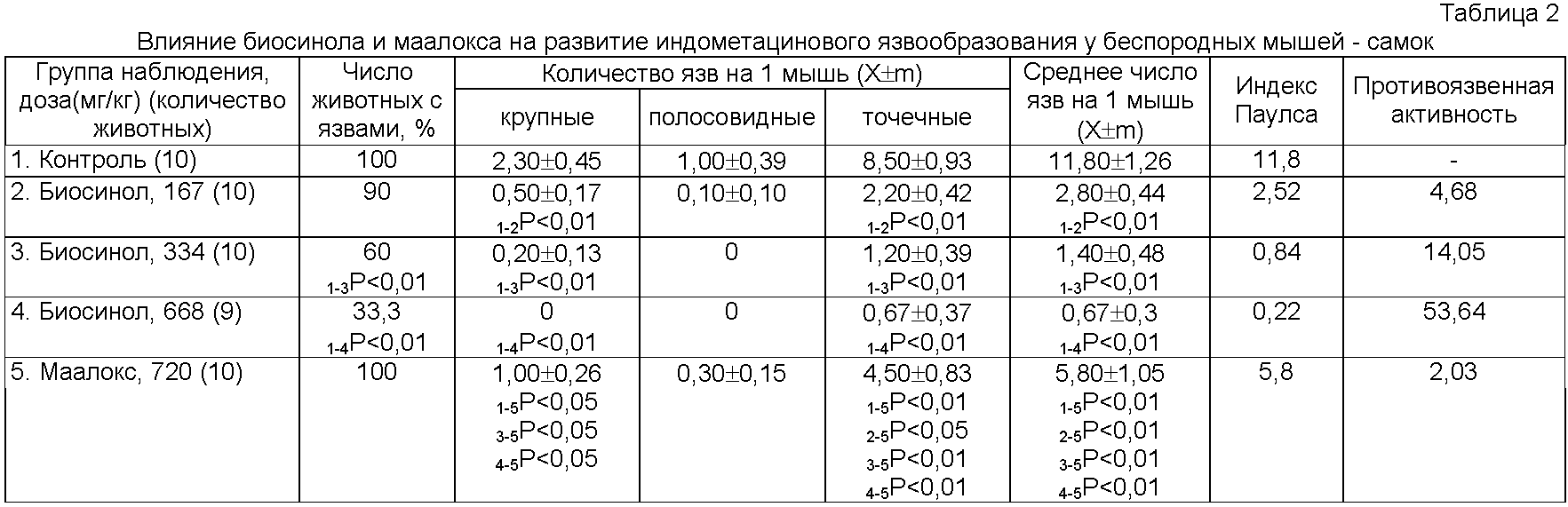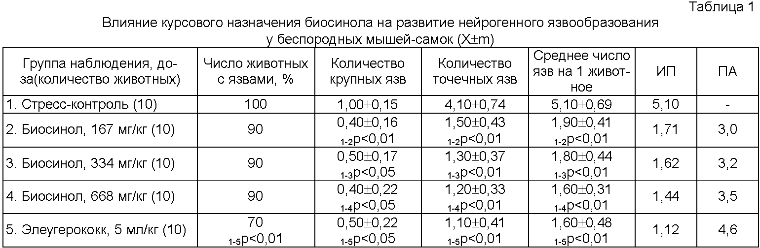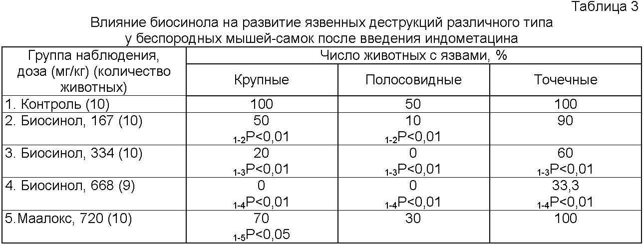 Изобретение относится к медицине, конкретно к фармакологии, и касается комплексного средства, повышающего защитную функцию слизистого барьера и устойчивость слизистой оболочки к действию повреждающих факторов, таких как стрессорное воздействие и применение нестероидных противовоспалительных средств. Существует многообразие этиопатогенетических факторов, обусловливающих ульцерогенные процессы, при этом нет доказательств приоритетного значения какого-либо из них в развитии язвенной болезни. Так, в настоящее время считается доказанным фактом значимая роль стресса в качестве «пускового механизма» и фактора хронизации ульцерогенеза. С другой стороны, ульцерогенное действие нестероидных противовоспалительных средств, применяемых по жизненным показаниям в рамках кардиальной и противоревматической терапии, определяет актуальность разработки профилактических и лечебных гастроэнтерологических мероприятий. Кроме того, существующие схемы стандартной терапии язвенной болезни желудка и двенадцатиперстной кишки сопровождаются побочными эффектами, в том числе и атрофическими изменениями слизистой оболочки желудка, и не всегда предотвращают развитие хронических вариантов течения заболевания. Все вышесказанное обусловливает целесообразность поиска и разработки лекарственных препаратов, способных повышать резистентность клеток гастродуоденальной слизистой к ульцерогенным факторам и регенеративную способность слизистой оболочки желудка и кишечника. Создание лекарственных средств с таким комплексным фармакологическим действием является насущным и перспективным направлением для отечественной фармацевтической промышленности. Наиболее близким (прототипом) является лекарственное средство – мизопростол, который является синтетическим производным простагландинов1 и относится к группе гастропротекторов, повышающих защитную функцию слизистого барьера и устойчивость слизистой оболочки к действию повреждающих факторов. Мизопростол является эффективным при энтеральном введении, особенно показан для профилактики язвенного поражения слизистой оболочки желудка при применении нестероидных противовоспалительных средств. По эффективности при остром развитии язвы желудка заметно уступает блокаторам гистаминовых Н-рецепторов, часто вызывает диарею. Поставленная задача достигается использованием в качестве гастропротекторного средства биологически активной добавки к пище «Биосинол», содержащей Диэнай С (кислота дезоксирибонуклеиновая 20 мг/1 г., крахмал картофельный, микрокристаллическая целлюлоза, полиэтиленоксид, натрия хлорид) 350 мг, экстракт коры осины 150 мг. Новым в предлагаемом изобретении является то, что биологически активная добавка к пище «Биосинол» (свидетельство о государственной регистрации Применение биологически активной добавки к пище «Биосинол» в качестве гастропротекторного средства в литературе не описано. Эти новые свойства «Биосинола» явным образом не вытекают из уровня техники и неочевидны для специалиста. Биосинол может применяться в качестве гастропротекторного средства для профилактики ятрогенного поражения слизистой желудка при длительном использовании нестероидных противовоспалительных средств, для предотвращения развития стрессорных язв слизистой желудка 