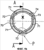 Вытянутые отверстия 71 расположены во внешней части по окружности мембраны 70. В представленном варианте реализации имеются три отверстия 71 равной длины и равного размера, причем каждое отверстие 71 занимает угол меньше 120°. Однако может иметься другое количество отверстий. Отверстия 71 предпочтительно расположены симметрично относительно оси во внешней части мембраны.