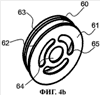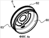 Седло 6 клапана представлено на фиг.4а-4е. Оно имеет круглую, по существу плоскую закрывающую поверхность 61 и выполненное с ней как единое целое внешнее кольцо 60. В закрывающей поверхности 61 имеется центральное отверстие 64 и окружные отверстия 65. Окружные отверстия 65 предпочтительно образуют общую окружность, центральная точка которого совпадает с центральной точкой круглой закрывающей поверхности 61. Предпочтительно предусмотрены три окружных отверстия 65, причем общая окружность прерывается перемычками 66. Как лучше всего видно на фиг 4с и 4е, от кольца 60 выступает периферический край 62 закрывающей поверхности 61. Кроме того, кольцо 60 имеет внешний буртик 63 в нижней части, удаленной от закрывающей поверхности 61. Эта часть может иметь маркировку. Соответствующий пример обозначен на чертежах позицией 67.