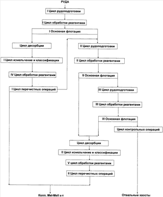 1. Способ флотационного обогащения сульфидных руд, включающий измельчение руды и коллективную флотацию в открытом цикле двух и более металлов в щелочной среде, создаваемой известью, перечистку доизмельченного чернового концентрата, отличающийся тем, что исходное питание поступает в цикл рудоподготовки, включающий измельчение и классификацию, подготовленный материал поступает в I основную флотацию, пенный продукт I основной флотации поступает в цикл десорбции, включающий операцию десорбцию, операцию отмывки и операцию сгущения, далее материал поступает в цикл измельчения и классификации, включающий операцию классификации, операцию доизмельчения и операцию механохимической активации, далее материал поступает в цикл обработки реагентами, включающий операции агитации с подогревом в присутствии депрессора и операцию агитации в присутствии депрессора, далее продукт поступает в цикл перечистных операций, включающий перечистную операцию или цикл перечистных операций, проводимых в присутствии сульфгидрильного собирателя и вспенивателя с получением 1-го коллективного концентрата и хвостов, которые совместно с камерным продуктом I основной флотации направляют в цикл рудоподготовки, включающий операцию классификации, измельчения и агитации, перед II основной флотацией; II основную флотациию проводят в присутствии сульфгидрильного собирателя и вспенивателя с получением коллективного концентрата II основной флотации и хвостов; хвосты II основной флотации поступают в цикл рудоподготовки, включающий операции классификации и измельчения; измельченный продукт поступает в цикл операций обработки реагентами, включающий операции контактирования с реагентами: диспергатором и депрессором и поступают на III основную флотацию, проводимую в присутствии сульфгидрильного собирателя и вспенивателя с получением коллективного концентрата III основной флотации и отвальных хвостов; объединенный пенный продукт II и III основной флотации поступает в цикл десорбции, включающий операции десорбции, отмывки и сгущения; далее продукт поступает в цикл измельчения и классификации, включающий операции классификации и доизмельчения песков классификации до класса не менее 90% класса – 74 мкм; далее продукт поступает в цикл обработки реагентами, включающий операции механохимической активации измельченного продукта, операции агитации с подогревом в присутствии диспергатора и депрессора; после подогрева материал поступает в цикл перечистных операций, проводимых в присутствии сульфгидрильного собирателя и вспенивателя с получением 2-го коллективного концентрата.