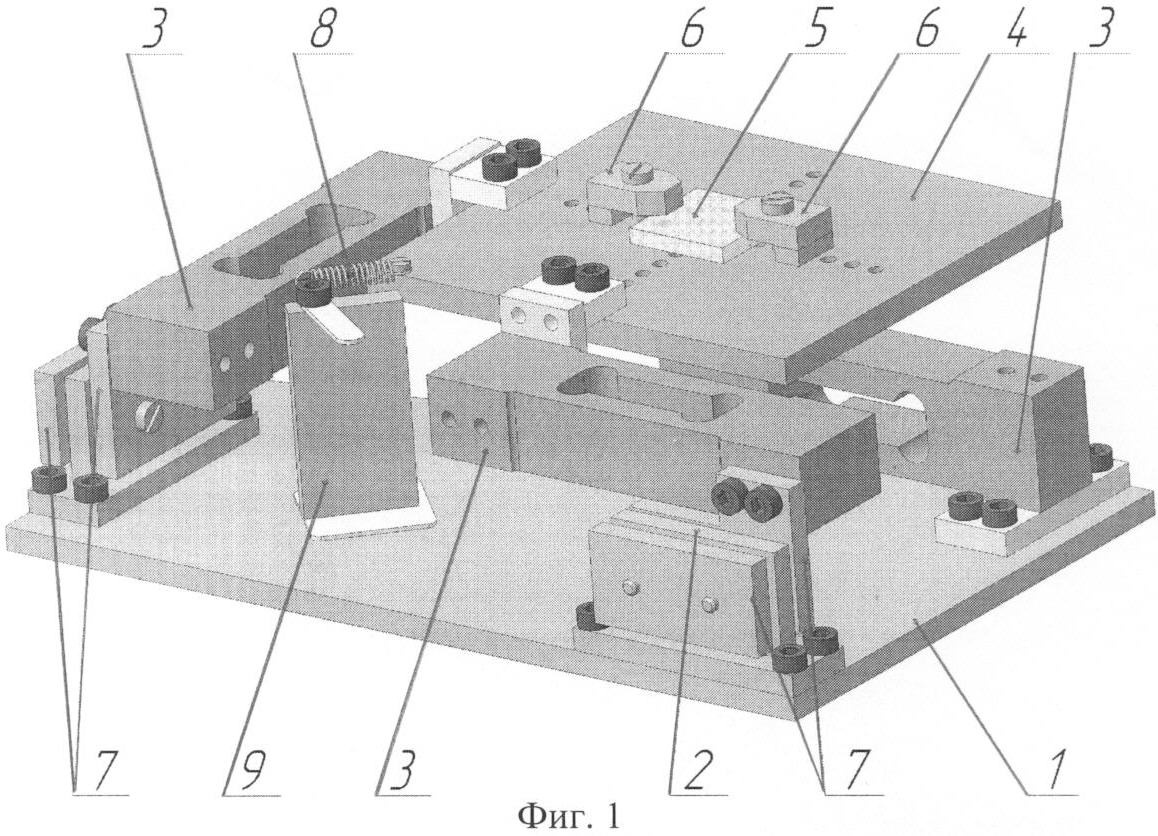 Обрабатывающий инструмент (фреза) надвигают на заготовку 5. При резании возникает сила, направленная от инструмента к заготовке 5. Составляющие силы резания независимо измеряют устройством в трех ортогональных направлениях при помощи трех соответствующих датчиков 3. Посредством дополнительных направляющих 7 с узлами трения качения, при измерении силы резания, достигают независимости определения величин составляющих силы резания. При этом датчики 3 имеют одну степень свободы – перемещение в направлении, перпендикулярном измеряемому усилию. Благодаря этому ортогональные составляющие силы резания заготовки 5 передаются только на соответствующие датчики 3 (заготовку предварительно прикрепляют к пластине 4).