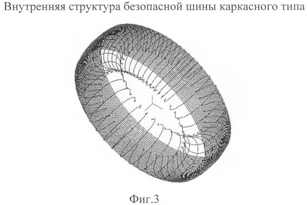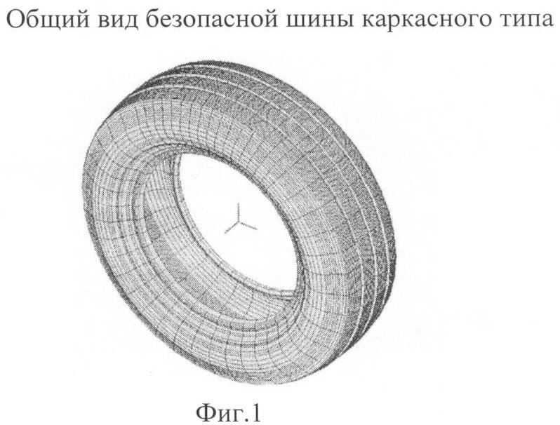 В этой связи важнейшей задачей обеспечения подвижности автомобиля является создание новой конструкции безопасной шины каркасного типа (фиг.1), позволяющей шине работать или при нормальном атмосферном давлении в ее полости, или при небольшом избыточном давлении, сохраняя профиль и габариты пневматической шины. Возможность работать без избыточного давления заявленная шина получила в результате замены нитей корда каркаса, работающих на растяжение, на упругие, определенным образом установленные пружинящие элементы, воспринимающие радиальную нагрузку на шину, с оптимальным их расположением по упругости в каркасе шины.