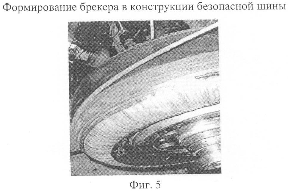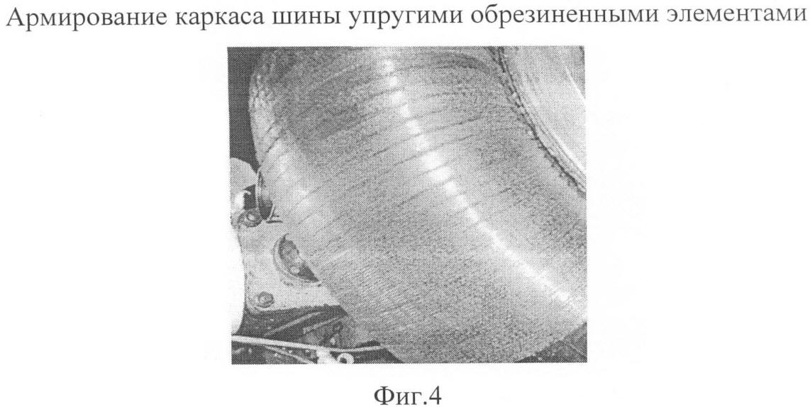 Проволоке придавалась форма, соответствующая профилю накаченной шины (фиг.3). Сборка шины осуществлялась методом навивки узкой профилированной резиновой ленты и укладки упругих элементов в меридиональном направлении на дорн с последующей фиксацией на спиральновитом проволочном бортовом кольце (фиг.4 и 5). Бездиафрагменная вулканизация собранных шин осуществляется на этом же металлическом тороидальном дорне. Предлагаемая конструкция безопасной шины каркасного типа устанавливается на серийно-выпускаемые ободья, в том числе неразъемного типа.