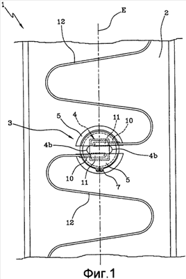 Предпочтительно, электронный блок 4 способен взаимодействовать с электронным устройством, расположенным на приборной панели транспортного средства. Для осуществления сообщения между электронным блоком 4 и электронным устройством на приборной панели оборудуется антенна 12 для оперативного соединения с электронным блоком 4. Антенна 12 может содержаться в упомянутом электронном блоке или, предпочтительно, устанавливается на радиально направленную внутреннюю поверхность 2 шины 1.