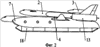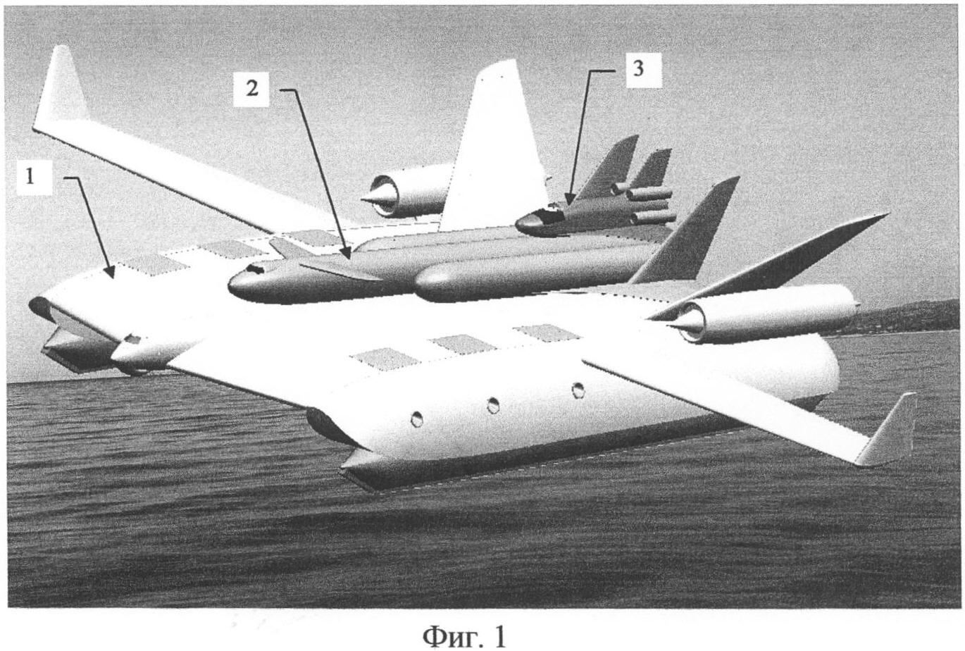 2. Супертяжелый реактивный самолет-амфибия для комплексной системы, содержащий центроплан – крыло малого удлинения с концевыми продольными бортотсеками и двумя консолями крыла, кили-стабилизаторы, маршевые двигатели в хвостовой части самолета, подъемные двигатели и кабину экипажа, а также выпускное поплавковое шасси внизу бортотсеков, отличающийся тем, что подъемные двигатели с воздухозаборниками размещены в верхних частях бортотсеков, их выхлопные тракты у каждого разделены на два выхода через наружные и внутренние стенки бортотсеков и снабжены управляемыми поворотными головками изменения направления их тяги в продольной плоскости, а на нижней поверхности центроплана крыла в передней и задней частях установлены управляемые щитки формирования поверхностью центроплана-крыла с поплавками и бортотсеками поддувной камеры обеспечения бесконтактного взлета и посадки при подаче выхлопных струй газа от внутренних головок подъемно-маршевых двигателей, при этом маршевые двигатели и кили-стабилизаторы размещены над бортотсеками, освобождая верхнее свободное пространство на центроплане-крыле, на котором установлены механизмы крепления и сброса назад связки разгонного блока с воздушно-космическим самолетом, снимающие блокировку запуска их ракетных двигателей после сдвига связки на безопасную для самолета дистанцию или полного сброса связки в атмосферу.