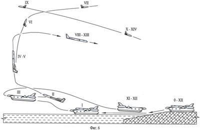 Этап «взлет» начинается на суше запуском подъемных 14 (поз.I VI) и маршевых 12, 13 двигателей, причем поворотные головки 17 (поз.I ХII) подъемных двигателей поворачиваются на парирование тяги малого газа маршевых двигателей, и самолет подъема 1 остается на заторможенных колесах своих перекатных шасси на площадке. Затем поворотом головок 17 подъемных двигателей 14 вниз-назад и первоначальным отклонением передних 19 и задних 20 отклоняемых щитков включается подача воздуха через внутренние поворотные головки 17 в образовавшуюся нижнюю поддувную камеру. Самолет подъема 1 приподнимается и на лыжах поплавков 18 по спуску сходит в море. В воде производится довыпуск передних 19 и задних 20 отклоняемых щитков, и увеличивается подача воздуха через внутренние поворотные головки 17 в нижнюю поддувную камеру. Самолет подъема 1 «вспухает», его эластичные поплавки 18 выходят из воды и под воздействием тяги маршевых двигателей 12, 13 и горизонтальной составляющей наклонной тяги подъемных двигателей 14 он разгоняется. По мере нарастания подъемной силы от образующейся под крылом-центропланом 5 динамической воздушной подушки и аэродинамической подъемной силы крыла-центроплана 5 и консолей 8, 9 самолет подъема 1 полностью отрывается от воды и уходит в полет. Отклоняемые щитки 19, 20 и поплавки 18 ПВПУ убираются, управляемые поворотные головки 17 подъемных двигателей 14 разворачиваются на увеличение горизонтальной тяги, и скорость полета доводится до скорости набора высоты (поз.I).