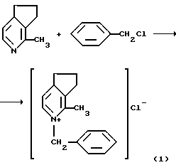(57) Реферат: Изобретение относится к новому химическому соединению 2-метил-3,4-триметиленпиридинийбензилхлориду, который может быть использован в качестве ингибитора коррозии стали в минерализованных средах в нефтяной промышленности или в системах оборотного водоснабжения. 1 табл. Изобретение относится к новый химическим соединениям, конкретно, 2-метил-3,4-триметиленпиридинийбензилхлориду общей формулы (1), который может быть использован в качестве ингибитора коррозии стали в минерализованных агрессивных средах, например, в нефтяной промышленности или в системах оборотного водоснабжения ![]() В литературе отсутствуют сведения о синтезе и свойствах 2-метил-3,4-триметиленпиридинийбензилхлорида, указанное соединение получено впервые. Известно большое количество ингибиторов коррозии стали, полученных на базе полиалкилпиридинов, например, реагент И-1-В (ТУ 103238-74), являющийся смесью модифицированных полиалкилпиридинов или реагент ИКИХП-2, являющийся продуктом конденсации хлорметилированных продуктов с пиридином [Г.З.Ибрагимов и др. Применение химических реагентов для интенсификации добычи нефти. М.: Недра, 1991 г., с. 25]. Известные ингибиторы предназначены, главным образом, для предотвращения коррозии стали в соляной кислоте. Кроме того, они обладают чрезвычайно неприятным запахом, что требует специальных мероприятий по охране труда и экологии. Наиболее близким по структуре и свойствам к заявляемому объекту является реагент Катапин-А [там же], полученный из алкилбензилхлористого и пиридина. Он является одним из лучших ингибиторов соляно-кислотной коррозии, но недостаточно эффективен в минерализованных средах с высоким содержанием кислорода. Целью изобретения является выявление новых производных пиридина, эффективно снижающих коррозию стали в минерализованных агрессивных средах с высоким содержанием кислорода. Поставленная цель достигается синтезом 2-метил-3,4-триметиленпиридинийбензилхлорида формулы (1). Предлагаемое соединение получают смешиванием эквимольных количеств 2-метил-3,4-триметиленпиридина с хлористым бензилом при 120-130oC в течение 4-6 ч. Получают индивидуальный 2-метил-3,4-триметиленпиридинийбензилхлорид (1) с выходом 95-99% по схеме: ![]() Синтез 2-метил-3,4триметиленпиридинийбензилхлорида (1) иллюстрируется примером 1. Пример 1. В стеклянный реактор, снабженный механической мешалкой, термопарой, обогревательной рубашкой и воронкой с противодавлением, загружают 0.1 моль хлористого бензила и 0.1 моль 2-метил-3,4-триметиленпиридина, при 125oC перемешивают 5 часов. Получают 2-метил-3,4-триметиленпиридинийбензилхлорид (1) с выходом 97%. Данные элементного анализа (1). Найдено, %: C, 73.54; H 6.98; N, 5.32; Cl 13.71. C16H18NCl. Вычислено, %: C, 73.99; H, 6.94; N, 5.39; C1 13.68. Полученная смесь при температуре выше 140oC разлагается, плохо растворима в спиртах, кетонах, нерастворима в углеводородах, хорошо растворима в воде. Испытания защитного действия 2-метил-3,4-триметиленпиридинийбензилхлорида (1) в качестве ингибитора коррозии проводили в лабораторных условиях по ОСТ 39-099-79 “Ингибиторы коррозии. Метод оценки эффективности защитного действия ингибиторов коррозии в нефтепромысловых сточных водах”, ВНИИСПТнефть, 1980. В качестве коррозионных сред использовали модель сточной воды (МСВ) следующего состава (d=1.1 г/см3), г/л: CaSO4 2H2O – 1.4CaCl2 2H2O – 2.3NaCl – 144 MgCl2 6H2O – 2.2Содержание O2 в МСВ со