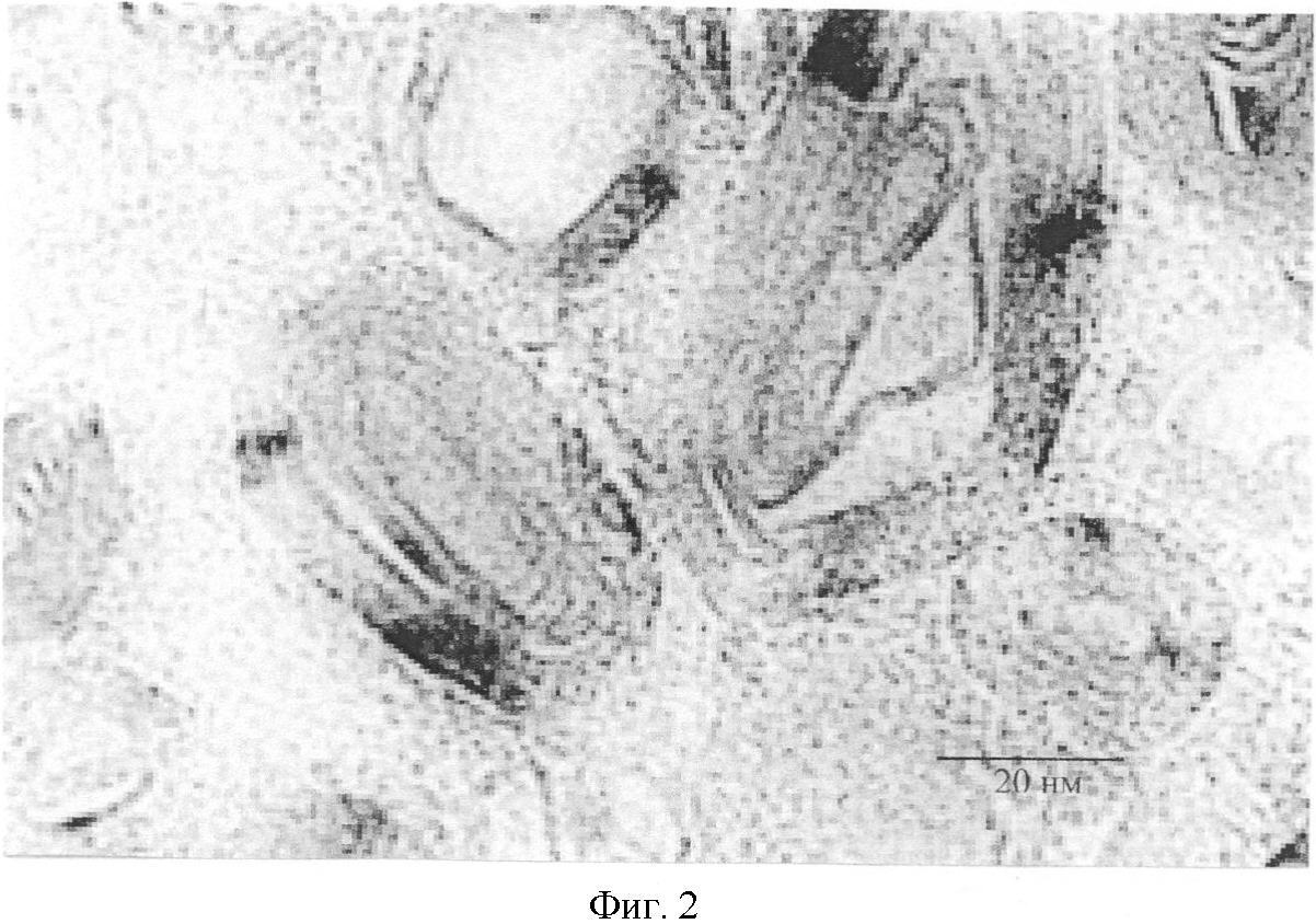 – с помощью электронного просвечивающего микроскопа, например JEM-100C, и стандартных образцов латексных шариков определяют размеры, форму и соотношение внешних диаметров тороидальных наночастиц и толщины их многослойного тела.