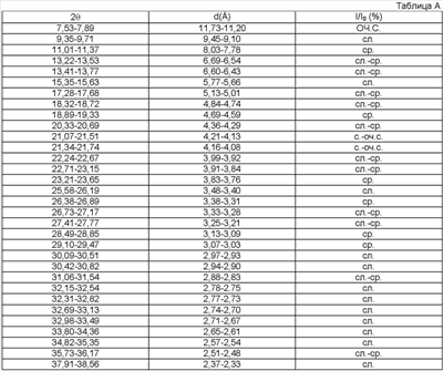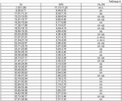 и характеризующийся тем, что он имеет картину дифракции рентгеновских лучей, имеющую, по меньшей мере, межплоскостные расстояния d и интенсивности, представленные в Таблице А: