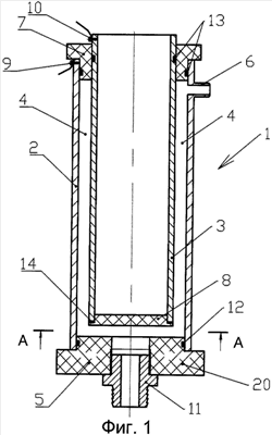 1. Устройство электрохимической обработки воды, включающее металлический корпус цилиндрической формы – катод, внутри корпуса размещена цилиндрическая вставка из алюминиевого сплава – анод с образованием между внутренней поверхностью корпуса и наружной поверхностью вставки полости, в одном конце корпуса размещено устройство для подвода в полость обрабатываемой воды, а в другом конце корпуса размещено устройство для отвода из полости обработанной воды, корпус и вставка содержат контакты для подсоединения к источнику питания электрического тока, а упомянутая полость выполнена герметичной, при этом герметичность упомянутой полости обеспечена с одной стороны корпуса упомянутым устройством для подвода воды и заглушкой торца упомянутой вставки, а с другой стороны корпуса – втулкой, размещенной между внутренней поверхностью корпуса и наружной поверхностью вставки за упомянутым устройством для отвода из полости обработанной воды, при этом устройство для подвода воды, заглушка и втулка выполнены из неэлектропроводного материала.