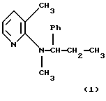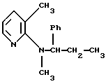 Пример. К 10 ммоль EtMgBr в растворе ТГФ в атмосфере аргона добавляют 10 ммоль бензальметиламина и перемешивают 2 ч при температуре ~40oC. Добавляют при температуре ~ 0oC 0,3 моль Pd(PPh3)4 и 2-бром-3,5-метилпиридина, перемешивают при температуре ~ 40oC 8 часов (общее время 10 ч). Реакционную массу охлаждают до ~ 20oC, добавляют насыщенный раствор NH4Cl, органический слой экстрагируют эфиром, сушат MgSO4. Получают 2-(N-метиил- -фенил(н-пропил)амин)-3-метилпиридин с выходом 86%. Rf 0,63 (силикагель L, 40/100, гексан/этилацетат = 7: 3), nD20 1,5861, ИК-спектр (V, см-1): 3060, 2965, 2870, 1600, 755, 700. Спектр ( , м.д.): 0.98 т (3H, CH3, J = 7 Гц), 1.52 – 2.36 м (3H, CH2, CH2), 2.27 с (3H, CH3), 2.75 с (3H, CH3N), 5.82 – 8.82 м (3H, пиридиновые), 7.26 с (5HPh). M+ 240.