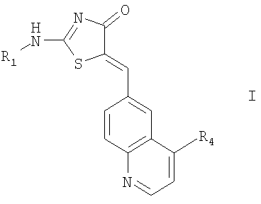 5. Соединение по п.4, где указанное соединение выбрано из группы, включающей 2-амино-5-(4-метоксихинолин-6-илмет-(Z)-илидин)тиазол-4-он 2-амино-5-[4-(2-метоксиэтокси)хинолин-6-илмет-(Z)-илидин]тиазол-4-он и 2-амино-5-(4-бутоксихинолин-6-илмет-(Z)-илидин]тиазол-4-он.