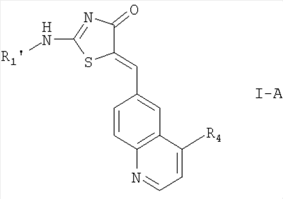 49. Соединение по п.48, где указанное соединение выбрано из группы, включающей 5-(4-феноксихинолин-6-илмет-(Z)-илидин)-2-[(тиофен-2-илметил)амино]тиазол-4-он, 5-(4-циклогексилметоксихинолин-6-илмет-(Z)-илидин)-2-[(тиофен-2-илметил)амино]тиазол-4-он и 5-(4-морфолин-4-илхинолин-6-илмет-(Z)-илидин)-2-[(тиофен-2-илметил)амино]тиазол-4-он.