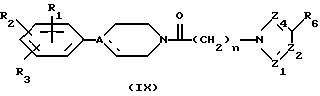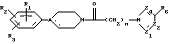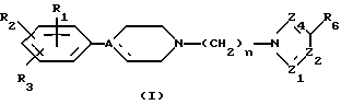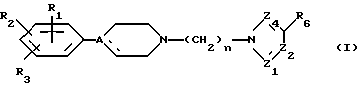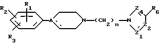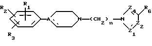 (57) Реферат: Изобретение относится к новым тетрагидропиридин- или 4-гидроксипиперидин-алкилазолам формулы I, где R1, R2, R3 и R6 обозначают водород, галоген, С1-С6-алкил, С1-С6-перфторалкил, С1-С6-алкоксил или два смежных радикала могут образовывать приконденсированное бензольное кольцо, А обозначает атом углерода, а пунктирная линия обозначает дополнительную связь, или А обозначает атом углерода, связанный с гидроксильной группой (C-OH), а пунктирная линия обозначает отсутствие дополнительной связи, n = 2 – 6, Z1, Z2 и Z3 обозначают атом азота или замещенный атом углерода, или их физиологически премлемым солям, которые обладают антипсихотической или анксиолитической активностью. 8 с. и 2 з.п. ф-лы, 3 табл.
