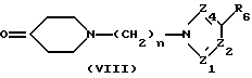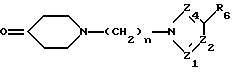 Новые производные общей формулы (I) можно получать следующими способами:СПОСОБ А Путем взаимодействия спиранового производного общей формулы (II): ![]() в которой R1, R2, R3 и А имеют вышеуказанное значение, “m” может иметь значения 0 – 4 и X обозначает удаляемую группу, как хлор, бром, мезилокси-группа или тозилокси-группа; с азотсодержащим гетероциклом общей формулы (III): ![]() в которой Z1, Z2, Z4 и R6 имеют вышеуказанное значение. Реакцию осуществляют в растворе диметилсульфоксида; диметилформамида, спирта, такого как этанол, ароматического углеводорода, такого как толуол, или алифатического углеводорода, такого как гексан, или простого эфира, как диоксан. Эту реакцию проводят предпочтительно в присутствии основания, как карбонат калия или триэтиламин. Температура реакции изменяется от комнатной до температуры кипения используемого растворителя. Время реакции составляет 1-24 часа; СПОСОБ Б Путем одновременного “в одну стадию” взаимодействия между производным общей формулы (IV), алкилирующим агентом общей формулы (V) и азотсодержащим гетероциклом общей формулы (III): ![]() ![]() ![]() где R1, R2, R3, A, X, “n”, Z1, Z2, Z4 и R6 имеют вышеуказанное значение. Реакцию проводят в растворе диметилсульфоксида, диметил формамида, спирта, такого как этанол, ароматического углеводорода, такого как толуол, или алифатического углеводорода, такого как гексан, или простого эфира, как диоксан. Эту реакцию проводят предпочтительно в присутствии основания, например карбоната калия или триэтиламина. Температура реакции изменяется в пределах от комнатной до температуры кипения используемого растворителя. Время реакции составляет от 1 до 24-х часов; СПОСОБ В Получение соединений общей формулы (I) можно осуществлять путем взаимодействия в условиях алкилирования аминов общей формулы (IV): ![]() в которой R1, R2, R3 и A имеют вышеуказанное значение, с соединениями общей формулы (VI): ![]() в которой X, “n”, Z1, Z2, Z4 и R6 имеют вышеуказанное значение. Реакцию проводят в растворе диметилсульфоксида, диметилформамида, спирта, такого как этанол, ароматического углеводорода, такого как толуол, или алифатического углеводорода, такого как гексан, или простого эфира, такого как диоксан. Эту реакцию осуществляют предпочтительно в присутствии основания, как карбонат калия или триэтиламин. Температура реакции изменяется в пределах от комнатной до температуры кипения используемого растворителя. Время реакции составляет от 1 до 24-х часов; СПОСОБ Г Соединения общей формулы (I) можно получать путем взаимодействия, в условиях алкилирования, соединения общей формулы (VII): ![]() в которой R1, R2, R3, “n” и A имеют вышеуказанное значение, с азотсодержащим гетероциклом общей формулы (III): ![]() в которой Z1, Z2, Z4 и R6 имеют вышеуказанное значение. Реакцию проводят в растворе диметилсульфоксида, диметилформамида, спирта, такого как этанол, ароматического углеводорода, такого как толуол, или алифатического углеводорода, такого как гексан, или простого эфира, такого как диоксан. Эту реакцию проводят предпочтительно в присутствии основания, например карбоната калия или триэтиламина. Температура реакции изменяется в пределах от комнатной до температуры кипения используемого растворителя. Время реакции составляет от 1 до 24-х часов; СПОСОБ Д Путем дегидратации соединений общей формулы (I) ![]() в которой R1, R2, R3, “n”, Z1, Z2, Z4 и R6 имеют вышеу