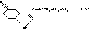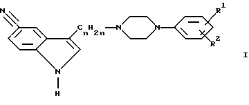 Пример 1Раствор из 2,6 г 3-(4-хлорбутил)-5-циан-индола (“А”) и 1,7 г 1-(4-циан-фенил)пиперазина (“Б”) в 200 мл ацетонитрила перемешивают в течение 12 часов при 20oC, обрабатывают как обычно и получают 3-/4-(4-(4-циан-фенил)-1- пиперазинил)бутил/-5-циан-индол-гидрохлорид; т.пл. 262,5 – 263,5oC. Аналогичным образом, путем взаимодействия “А” с 1-(4- фтор-фенил)-пиперазином получают 3-/4-(4-(4-фтор-фенил)-1- пиперазинил)бутил/-5-циан-индол-гилрохлорид, т.пл. 248-249oC; 3-(3-хлорпропил)-5-циан-индола с “Б” получают 3-/3-(4- 4-циан-фенил)-1-пиперазинил)-пропил/-5-циан-индол, т.пл. 219-220oC; “А” с 1-(2-циан-фенил)-пиперазином получают 3-/4-(4- (2-циан-фенил)-1-пиперазинил) бутил/-5-циан-индол-гидрохлорид, т.пл. 232oC. Пример 2 Раствор из 10,8 г 3-/4-N,N-бис-(2-хлор-этил)- аминобутил)-5-циан-индола и одного эквивалента 3-фтор-4-циан- анилина в 200 мл ацетонитрила перемешивают в течение 12 часов при комнатной температуре, обрабатывают как обычно и получают 3- /4-(4-(3-фтор-4-циан-фенил)-1-пиперазинкл) бутил/-5-циан-индол; т.пл. 117,5-118,5oC. Была исследована ингибирующая активность некоторых соединений формулы (I), а также соединений сравнения C1 и C2, известных из EP 0496222 A1. Соединения использовали в концентрации нмоль/литр, температура плавления приведена в oC. Ингибирующую активность определяли в соответствии с методом, описанным K.A.Sherman, M.J.Zigmond, J. Hamin, Life Sciences, 1978, 23, 1863-1870. Данные по биопригодности определяли стандартным способом. После использования 1 мг вещества на кг веса тела (i.v., р.о.) определяли концентрацию в плазме. Определяли ингибирующую активность IC50 соединений формул: ![]() ![]() ![]() Полученные данные приведены в таблице. Приведенные данные свидетельствуют об ингибирующей активности соединений в отношении повторного поглощения серотонина. Соединения C1 и C2 характеризуются IC50 более 1000 и 10 нмоль/литр, в то время как соединения формулы (I) согласно изобретению IC50 от 6 до 0,7, т.е. соединения формулы (I) проявляют активность в 1000 раз большую, чем известные соединения. Нижеследующие примеры относятся к фармацевтическим композициям. Пример А: Флаконы для инъекций Раствор из 100 г биологически активного вещества формулы (I) и 5 г вторичного кислого фосфата натрия в 3 л дважды перегнанной воды доводят до pH= 6,5 с помощью 2 н. соляной кислоты, стерильно фильтруют, разливают в флаконы для инъекции, лиофилизируют в стерильных условиях и стерильно закрывают. Каждый флакон с препаратом для инъекции содержит 5 мг биологически активного вещества. Пример Б: Свечи Расплавлять смесь из 20 г биологически активного вещества формулы (I) вместе со 100 г соевого лецитина и 1400 г масла какао, разливают в формы и оставляют охлаждаться. Каждая свеча содержит 20 мг биологически активного вещества. Пример В: Раствор Готовят раствор из 1 г биологически активного вещества формулы (I), 9,38 г NaH2PO4 2H2O, 28,48 г Na2HPO4 12H2O и 0,1 г бензальконийхлорида в 940 мл дважды перегнанной воды. Устанавливают pH = 6,8, доливают до общего объема 1 л и стерилизуют путем облучения. Этот раствор можно применять в форме глазных капель.