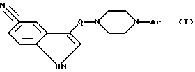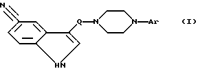 Изобретение относится к соединениям формулы (I) ![]() где Ar означает одно- или двукратно замещенный с помощью CN и/или F фенильный остаток; Q обозначает CnH2n; и n обозначает 3 или 4; а также к их солям, за исключением 3-[4-(4-(4-фторфенил)-1- пиперазинил)бутил] -5-циан-индола и 3-[4-(4-(2-фторфенил)-1- пиперазинил)бутил]-5-циан-индола, но не их кислотноаддитивных солей. Подобные соединения известны из европейского патента EP 0376607, патента Бельгии 771285, патента Великобритании 1075156, патента Франции 1551082 и в частности из патента ФРГ 4101686-A1 (соответствующего европейскому патенту EP 0496222-A1). По отношению к указанной последней заявке на патент предлагаемые согласно изобретению соединения по сравнению с замещенными метоксигруппами известными соединениями отличаются улучшенной оральной биодоступностью и представляют собой селективное изобретение, в частности в патенте ФРГ 4101686. В основу изобретения положена задача получения новых соединений с ценными свойствами, в частности таких, которые можно применять для приготовления лекарственных средств. Найдено, что соединения формулы (I) и их физиологически приемлемые соли присоединения кислоты при хорошей совместимости обладают очень ценными фармакологическими свойствами. Так, они в частности оказывают воздействие на центральную нервную систему, прежде всего они проявляют 5-HT1A-антагонистические и подавляющие 5-HT- Reuptake активности. Они подавляют связывание содержащих тритий серотониновых лигандов с гиппокампальными рецепторами (Cossery и др., European J. Pharmacol., 140 (1987), 143-155). Кроме того, происходят изменения в отношении аккумуляции DOPA (диоксифенилаланина) в Striatum и 5-HTP-аккумуляции в N. raphe (Seyfried и дp. , European J. Pharmacol. 160 (1989), 31-41). Далее, проявляются анальгетические и снижающие кровяное давление активности; так, в случае бодрствующих, со вставленным катетером, спонтанно гипертонических крыс (род SHR/Okamoto /N1H-MO-CHB-Kisslegg; Методы; см. Weeks и Jones, Proc. Soc. Exptl. Biol.Med 104 (1960), 646-648) прямо измеряемое кровяное давление снижается после перорального введения соединений. Точно так же они пригодны для профилактики и для борьбы с последствиями церебрального инфаркта (apoplexia cerebri), как инсульт и церебральные ишемии, а также для лечения экстрапирамидально-двигательных побочных действий нейролептических средств, а также болезни Паркинсона. Соединения формулы (I) и их физиологически приемлемые соли присоединения кислоты поэтому можно применять в качестве биологически активных веществ в лекарственных средствах, в частности для анксиолитических, антидепрессивных, антипсихотических, нейролептических и/или антигипертонических средств и также в качестве промежуточных продуктов для получения других биологически активных веществ лекарственных средств. Предметом изобретения являются также фармацевтические композиции, отличающиеся тем, что они содержат по меньшей мере одно соединение формулы (I) и/или одну из его физиологически приемлемых солей присоединения кислоты. Предметом изобретения являются в частности фармацевтические композиции, содержащие по меньшей мере одно соединение, выбираемое из группы, состоящей из: а) 3-/4-(4-(4-циан-фенил)-1-пиперазинил)бутил/-5-циан-индола; б) 3-/3-(4-(4-циан-фенил)-1-пиперазинил)пропил/-5-циан-индола; в) 3-/4-(4-(4-фтор-фенил)-1-пиперазинил)бутил/-5-циан-индол- метан-сульфоната; г) 3-/4-(4-(2-циан-фенил)-1-пиперазинил)бутил/-5-циан-индола; д) 3-/4-(4-(3-фтор-4-