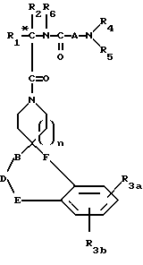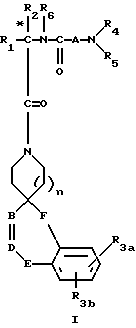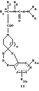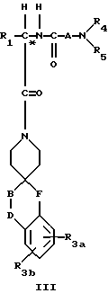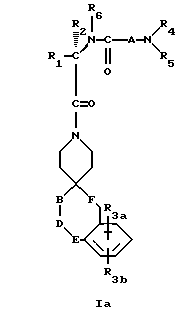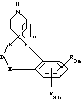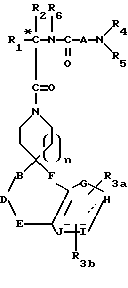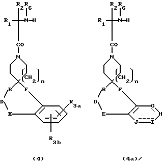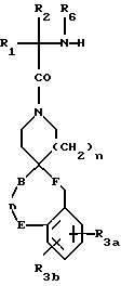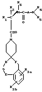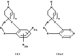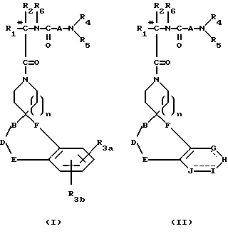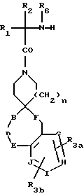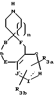 (57) Реферат: Предложены спиропиперидины формулы I или II, где R1 представляет арил-(С1-С6 алкил), С3-С7-циклоалкил-(С1-С6-алкил), арил-(С0-С5 алкил)-К-(С1-С6-алкил), С3-С7-циклоалкил-(С0-С5 алкил)-К-(С1-С5-алкил), где К представляет O, S(O)m, арил обозначает фенил, пиридил и индолил, которые могут быть замещены 1-2 атомами галогена; R2 является водородом, R3a и R3b являются водородом, атомом галогена, С1-С5 алкилом; R4 и R5 являются водородом, С1-С6-алкилом, замещенным 1-3 гидроксигруппами; R6 является водородом; А представляет группу -(СН2)x-С(R7)(R7a)-, где x = 0 или 1, R7 и R7a представляют собой С1-С6-алкил; причем один из В, D, Е, F представляет C(R8)(R10), O, С = O, S(O)m, NR9, причем В, D, Е или F может отсутствовать, обеспечивая образование 5-, 6-членного кольца, R8 и R10 представляют водород, R9 представляет R’2; SO2R’2, C(O)R’2, C(O)OR’2, SO2(CH2)q-арил, где R’2 может быть замещен галогеном, С1-С4-алкилом и др., R’2 является водородом или С1-С4-алкилом; q=0, 1; m = 0, 1 или 2; n = 1; G, Н, I и J представляют атомы углерода или серы так, что по крайней мере один является гетероатомом и один из G, Н, I и J может необязательно отсутствовать, что обеспечивает образование 5-членного гетероциклического или 6-членного ароматического кольца, и его фармацевтические соли и индивидуальные диастереоизомеры. Способ получения соединения формулы I или II включает взаимодействие соединения 4 или 4а с соединением формулы НООС-А-NR4R5 или НООС-А-N(R4)L, где L представляет защитную группу, которую затем удаляют (если она присутствует). Способ получения соединения формулы I или II путем взаимодействия соединения формулы (2) или (2а) с соединением формулы (12) или (12а), где L представляет защитную группу, которую затем удаляют. Способ повышения содержания эндогенного гормона роста у людей и животных, фармацевтическая композиция для повышения эндогенного продуцирования или выделения гормона роста у человека или животного. 5 с. и 6 з.п. ф-лы, 1 табл.