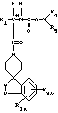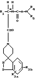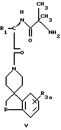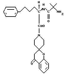 Пример 9N-/1(R)-/(6-Хлор-3H-4-оксоспиро/1H-хиназолин-2,4′- пиперидин/-1′-ил)карбонил/-2-(индол-3-ил)этил/-2-амино-2- метилпропанамидгидрохлорид Получают по способу примера 3, стадия B. Используют: 6-хлороспиро/пиперидин-4,2 (1’H)-хиназолин)-4(3H)онгидрохлорид (50 мг, 0,17 ммоль), Получают по способу примера 7, стадия D. Используют промежуточное соединение с предыдущей стадии (50 мг, 0,08 ммоль). Время реакции: 1 час. Выход 40 мг (89,5%). Масс-спектр с бомбардировкой быстрыми атомами, рассчитано для C27H31N6O3Cl 523, найдено 523 (М+H, 71%). Пример 10 N-/1(R)-/(1,4-Дигидро-4-фенил-1-оксоспиро/3H-2-бензопиран-3,4′ -пиперидин/-1′-ил )карбонил/-2-(индол-3-ил)- этил/-2-амино-2-метилпропанамидгидрохлорид Стадия A: 1,4-Дигидро-4-фенилспиро/3H-2-бензопиран- 3,4′-пиперидин/-1-он Получают по способу примера 3, стадия A, из 1′-бензил- 1,4-дигидро-4-фенилспиро(3H-2-бензопиран-3,4′-пиперидин)-1- онгидрохлорида (8 мг, 0,019 ммоль) и 5 мл этанола. Время реакции 45 минут. Выход 5,5 мг (98,5%). Масс-спектр с бомбардировкой быстрыми атомами, рассчитано для C19H19NO2 293, найдено 294 (М+H, 93%). Получают по способу примера 3, стадия B. Используют промежуточное соединение с предыдущей стадии (5 мг, 0,017 ммоль),