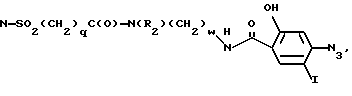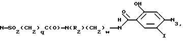 К раствору коммерчески доступного N-гидрокси-сукцинил- 4-азидо-2-гидроксибензоата в 5 мл CH2Cl2 добавляют 6- N-трет-бутоксикарбонил-н-гексиламингидрохлорид и 0,10 мл основания Ханинга и перемешивают в течение 4 часов. Реакционную смесь выпаривают досуха и обрабатывают хроматографически на 15 г силикагеля. В результате элюирования смесью гексаны-этилацетат (2:1) получают 0,229 ацилированного продукта. К 29 мг указанного ранее материала добавляют 2 мл THF и 2 мл 0,01 М водного гидроксида натрия, 25 мг йодида калия. Добавляют хлорамин-Т (15 мг) и перемешивают в течение 30 минут. Реакцию гасят 2 мл насыщенного раствора тиосульфата натрия, разбавляют 5 мл 0,05 н. HCl и экстрагируют этилацетатом (2 х 5 мл). Объединенные органические экстракты промывают рассолом (5 мл), сушат над сульфатом магния и концентрируют. В результате обработки остатка с помощью флеш-хроматографии (5 г силикагеля), элюируя смесью гексанэфир (3:1) получают 26 мг йодированного материала. Удаление защиты N-трет-BOC осуществляют 4 М HCl в этилацетате до получения 21,4 мг гидрохлорида. К раствору этого материала в 5 мл CH2Cl2 добавляют 49 мг кислотного промежуточного соединения со стадии A примера 33, 0,016 мл NMM, 19,8 мг HOBT и 29 мг EDC и перемешивают в течение 18 часов. Реакционную смесь обрабатывают и очищают обычным способом. Повторное удаление защиты N-трет-BOC группы осуществляют за счет 4 М HCl в этилацетате. Получают указанное в заглавии соединение в виде желто-коричневого твердого вещества. Этот материал подщелачивают, растворяя в 2 мл насыщенного NaHCO3, и экстрагируют CH2Cl2 (2 х 3 мл). Объединенные органические экстракты сушат над сульфатом натрия и концентрируют до получения указанного в заглавии соединения. 1H ЯМР (400 МГц, CDCl3): 8.40-8.20 (м, 1H), 7.95 (с, 2/3H), 7.90 (с, 1/3H), 7.40- 6.90 (м, 91/3H), 6.70 (с, 2/3H), 6.55 (м, 1H), 5.20-5.10 (м, 1H), 4.70-4.40 (м, 4H), 4.10-3.80 (м, 5H), 3.80-3.50 (м, 4H), 3.40-3.10 (м, 4H), 3.10-3.00 (м, 1H), 2.70 (дт, 1H), 1.90-1.20 (м, 14H), 1.30 (с, 6H).