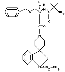 Пример 53N-/1(S)-/(1,2-Дигидро-1-метилсульфонилспиро/3H- индол-3,4′-пиперидин/-1′-ил)карбонил/-2-(фенилметилсульфонил) этил/-2-амино-2-метилпропанамидгидрохлорид Стадия A: N-/1(S)-/(1,2-Дигидро-1-метилсульфонилспиро/3H-индол-3,4′- пиперидин/-1′-ил)карбонил/-2- (фенилметил)сульфонил)этил/-2-амино-2-метил-пропанамид 2HPO4, к которому добавлено достаточно NaOH для создания pH более 9. Затем хлороформ удаляют, а водную фазу несколько раз экстрагируют хлороформом, объединенные органические экстракты сушат над сульфатом магния и концентрируют при пониженном давлении до смолы. В результате обработки с помощью препаративной TCX на пластине силикагеля GF 0,5:5:95 конц. NH4:MEOH:CHCl3, получают указанное в заглавии соединение в виде свободного основания, рассчитано для C27H36N4O6S2: MB 576,7, найдено: м/е = (М+1) 577,5. Стадия В: N-/1(S)-/(1,2-Дигидро-1-метилсульфонилспиро/ 3H-индол-3,4′-пиперидин/-1′-ил)карбонил/- 2-(фенилметилсульфонил)этил/-2-амино-2-метил- пропанамидгидрохлорид Гидрохлоридную соль соединения со стадии A получают, используя описанные ранее стандартные процедуры, и получают указанное в заглавии соединение. Пример 54 Получение двух N-/1(S)-/(1,2-дигидро-1-метилсульфонилспиро/ 3H-индол-3,4′-пиперидин/-1′-ил)карбонил/-2-(фенилметилсульфинил)этил/-2- амино-2-метилпропанамидгидрохлоридов Стадия A: N-/1(S)-/(1,2-Дигидро-1-метилсульфонилспиро/ 3H-индол-3,4′-пиперидин/-1′-ил)карбонил/-2- (фенилметилсульфинил)этил/-2-амино-2-метилпропанамид Подвергая более полярную полосу со стадии A примера 53 процедуре удаления защиты TFA /анизолом с последующей обработкой с помощью препаративной TCX, выделяют две полосы, соответствующие двум ожидаемым диастереоизомерным сульфоксидам. Для менее полярного диастереоизомера: рассчитано для C27H36N4O5S2: MB 560,7, найдено м/е = (М+1) 561,7. Для более полярного диастереоизомера рассчитано для C27H36N4O5S2: MB= 560,7; найдено м/е = (M+1) 561,7. Стадия В: N-/1(S)-/(1,2-Дигидро-1-метилсульфонилспиро/ 3H-индол-3,4′-пиперидин/-1′-ил)карбонил/- 2-(фенилметилсульфинил)этил/-2-амино-2-метилпропанамидгидрохлорид Указанное в заглавии соединение получают, заменяя соединение, полученное на стадии A примера 53 и на стадии В примера 53, на любое из соединений, выделенных ранее на стадии A. Пример 55 N-/1(R)-/(1,2-Дигидро-1-метансульфонилспиро/3H-индол-3,4′ -пиперидин/-1′-ил)карбонил/-2-(фенилметилокси)- этил/-2-амино-2-метилпропанамидмезилат Это соединение получают, обрабатывая свободное основание стадий C примера 18 метансульфоновой кислотой. Указанное в заглавии соединение получают за счет перекристаллизации его из смеси этилацетат-этанол-вода. Т.плавления 166-168oC. Пример 56 К раствору 0,108 г промежуточного соединения, полученного в примере 33 на стадии A, в 5 мл CH2Cl2 добавляют 20 мг 6-аминогексанола, 28 мг HOBT, и 42 мг EDC и перемешивают в течение 4 часов. Реакционную смесь разбавляют 10 мл CH2Cl2 и промывают 0,5 н. HCl (5 мл), насыщенным водным NaHCO3 (5 мл), сушат над сульфатом магния и концентрируют. Остаток очищают с помощью флеш-хроматографии (10 г силикагеля), элюируя смесью CH2Cl2-ацетон (1:1). К 56,2 мг вышеуказанного промежуточного соединения в 2 мл CH2Cl2 и 2 мл DMF добавляют 23 мг биотина, 14 мг DMAP, 28 мг EDC и перемешивают в течение 18 часов. Реакционную смесь обрабатывают обычным способом. В результате очистки с помощью флеш-хроматографии на 5 г силикагеля, элюируя смесью CH2Cl2-ацетон (1: 1) получают 22 мг биотинового конъюгата. Удаление защиты N-трет-BOC осуществляют в CH2Cl2-TFA до получения 18,9 мг указанного в