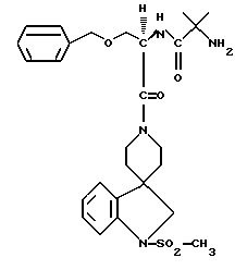 Пример 30N-[1(R)-[(1,2-Дигидро-этансульфонил-спиро[3H-индол- 3,4′-пиперидин] -1′-ил)карбонил] -2-(фенилметилокси)этил] -2- амино-2-метилпропанамидгидрохлорид К 5 г 1,2-дигидро-1-бензилоксикарбонид-спиро/3H-индол- 3,4′-пиперидин/гидрохлорида в 100 мл дихлорметана при комнатной температуре добавляют 3,64 г N-трет-BOC-O- бензил-D-серина, 1,83 г HOBT, 2,60 мл N-метилморфолина и 3,70 г EDC, и перемешивают в течение 18 часов. Реакционную смесь выливают в 100 мл воды и экстрагируют CH2Cl2 (2 х 100 мл). Объединенные органические слои промывают 100 мл 10% лимонной кислоты, 100 мл насыщенного NaHCO3, сушат над сульфатом магния и концентрируют. К раствору промежуточного соединения, полученного на стадии A, в 20 мл CH2Cl2 добавляют 20 мл трифторуксусной кислоты и перемешивают при комнатной температуре в течение 30 минут. Реакционную смесь концентрируют, разбавляют 50 мл дихлорметана и осторожно подкисляют 100 мл 10% водного раствора карбоната натрия. Органический слой выделяют, а водный слой экстрагируют далее 2 х 50 мл дихлорметана. Объединенные органические фракции промывают 50 мл воды, сушат над карбонатом калия, фильтруют и концентрируют до получения амина в виде густого масла. К вышеуказанному промежуточному соединению в 50 мл дихлорметана при комнатной температуре добавляют 2,50 г N-трет-BOC- -метилаланина, 1,83 г HOBT и 3,70 г EDC и перемешивают в течение 18 часов. Реакционную смесь выливают в 10 мл воды и экстрагируют CH2Cl2 (2 х 10 мл). Объединенные органические фракции промывают 20 мл 10% лимонной кислоты, 20 мл насыщенного NaHCO3, сушат над сульфатом магния и концентрируют. В результате обработки остатка с помощью флеш-хроматографии на 300 г силикагеля, элюируя смесью гексан-этилацетат (2:1), получают 8,1 г продукта.