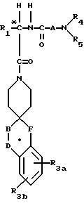 Стадия D: N-/1(R)-/(3,4-Дигидро-4-оксоспиро/2H-1- бензопиран-2,4′-пиперидин/-1′-ил)карбонил/- 4-фенилбутил-2-амино-2-метилпропанамидгидрохлоридРаствор промежуточного соединения с предыдущей стадии (40 мг, 0,071 ммоль) в этилацетате охлаждают до 0oC. Затем через раствор барботируют газообразный хлористый водород в течение 2 минут. Реакционную смесь перемешивают в течение 15 минут до тех пор, пока по данным ТСХ реакция не завершается. Полученный раствор концентрируют, и соль соляной кислоты (33,8 мг, 95,5%) используют без дополнительной очистки. 1H ЯМР (400 МГц, CD3OD): продукт существует в виде смеси двух конформеров (1:1): 8.271-8.229 (м, 1H), 7.799 (дд, 1 3/4 Гц, 7.84 Гц, 1H), 7.545 (кв, 1H) 7.289-7.006 (м, 7H), 4.737-4.703 (м, 1H), 4.277 (д, 1/2H), 4.186 (д, 1/2H), 3.555-3.292 (м, 1 1/2H), 3.187-3.068 (м, 1H), 2.809-2.724 (2м, 2H), 2.633-2.563 (м, 1H), 2.085-1.927 (м, 3 1/2H), 1.645, 1.639, 1.616 (3с, 6H), 1.677-1.603 (м, 3H), 1.316-1.279 (м, 2H).