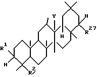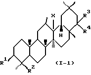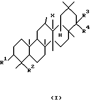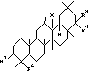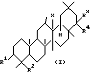 (57) Реферат: Описываются новые фармацевтические композиции для лечения гепатита, включающие в качестве активного ингредиента тритерпеновое производное общей формулы I или его соль, где 1 представляет гидроксильную группу, арилметилокси, низший алкокси или низший алканоилокси; R2 представляет низший алкенил, -CH2OR5, где R5 представляет атом водорода, арилметил, низший алкил или низший алканоил, формил, -COOR6, где R6 представляет атом водорода или низший алкил, или -CH2N(R7)R8, где R7 и R8, которые могут быть одинаковыми или различными, представляют собой атом водорода, низший алкил, арил или низший алканоил; или R1 и R2 могут соединяться друг с другом с образованием – O-C(R9)R10-O-CH2-, где R9 и R10, которые могут быть одинаковыми или разными, представляют низший алкил или арил; R3 и R4, которые могут быть одинаковыми или разными, представляют атом водорода, гидроксильную группу, гидроксиметил, -N(R11)R12, где R11 и R12 представляют низший алканоил, -OR13, где R13 представляет низший алкил, аралкил, низший алканоил, арилкарбонил, аралкилкарбонил, или арил(низший алкенил)карбонил; Х представляет собой О, СН2. Вписываются также новые тритерпеновые производные. 8 с. и 26 з.п.ф-лы, 1 табл., 1ил.