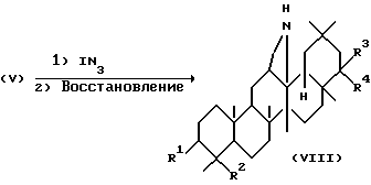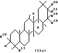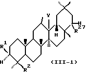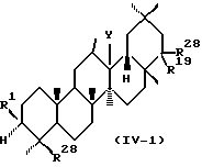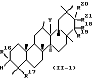 ![]() где R1 представляет гидроксильную группу, арилметилокси, низший алкокси или низший алканоилокси; R2 представляет низший алкенил, CH2OR5, где R5 представляет атом водорода, арилметил, низший алкенил или низший алканоил, формил: -COOR6, где R6 представляет атом водорода или низший алкил, или -CH2N(R7)R8, где R7 и R8, которые могут быть одинаковыми или различными, представляют собой атом водорода, низший алкил, арил или низший алканоил, или R1 и R2 могут соединяться друг с другом образованием – O-C(R9)R10-O-CH2-, где R9 и R10, которые могут быть одинаковыми или разными, представляют низший алкил или арил; R3 и R4, которые могут быть одинаковыми или разными, представляют атом водорода, гидроксильную группу, гидроксиметил, -N(R11)R12, где R11 и R12 представляют низший алканоил, -OR13, где R13 представляет низший алкил, аралкил, низший алканоил, арилкарбонил, аралкилкарбонил или арил(низший алкенил)карбонил; X представляет O, CH2. 2. Фармацевтическая композиция для лечения гепатита по п.1, где R1 представляет гидроксильную группу; R3 представляет атом водорода, а X представляет O. 3. Фармацевтическая композиция для лечения гепатита по п.1, где R1 представляет гидроксильную группу; R2 представляет гидроксиметил; R3 представляет атом водорода; R4 представляет гидроксильную группу или -OR13 и X представляет O. 4. Тритерпеновое производное общей формулы Ia или его соль ![]() где R1 представляет гидроксильную группу, низший алкокси или низший алканоилокси; R2 представляет гидроксиметил, низший алкоксиметил, или R1 и R2 могут соединяться друг с другом с образованием -O-C(R14)R15-O-CH2-, где R14 и R15 представляют низший алкил; R3 и R4, которые могут быть одинаковыми или разными, представляют атом водорода, гидроксильную группу, гидроксиметил, -N(R11)R12, где R11 и R12 представляют низший алканоил, -OR13, где R13 представляет низший алкил, аралкил, низший алканоил, арилкарбонил, аралкилкарбонил или арил(низший алкенил)карбонил; X представляет O, CH2, при условии, что соединения, где R1 представляет гидроксильную группу, R2 представляет гидроксиметил, R3 представляет атом водорода, R4 представляет гидроксильную группу и X представляет O, исключены. 5. Соединение или его соль по п.4, где R1 представляет гидроксильную группу; R3 представляет атом водорода, а X представляет O. 6. Соединение или его соль по п.4, где R1 представляет гидроксильную группу; R2 представляет -CH2OH; R3 представляет атом водорода; R4 представляет метокси и X представляет O. 7. Фармацевтическая композиция для лечения гепатита, включающая в качестве активного ингредиента тритерпеновое производное общей формулы II или его соль ![]() где R16 представляет гидроксильную группу, арилметилокси, низший алкокси или низший алканоилокси; R17 представляет низший алкенил, -CH2OR5, где R5 представляет атом водорода, арилметил, низший алкил, формил; -COOR6, где R6 представляет атом водорода; -CON(R29)R30, где R29 и R30, которые могут быть одинаковыми или разными, представляют атом водорода, низший алкил, низший алканоил, арил или аралкил; -CH2N(R7)R8, где R7 и R8, которые могут быть одинаковыми или различными, представляют водород или низший алкил; -C(R6)2OH, где R6 представляет водород или низший алкил, -COR6а, где R6а представляет низший алкил, -CH2=CH2-, или R16 и R17 могут соединяться друг с другом с образованием -O-C(R9)R10-O-CH2-, где R9 и R10, которые могут быть одинаковыми или разными, представляют низший алкил или арил; R18 и R19, которые могут быть одинаков