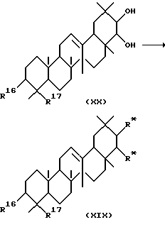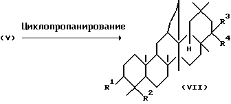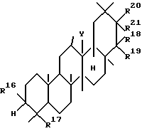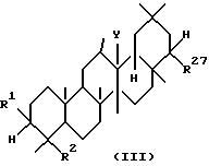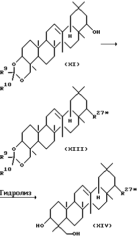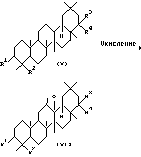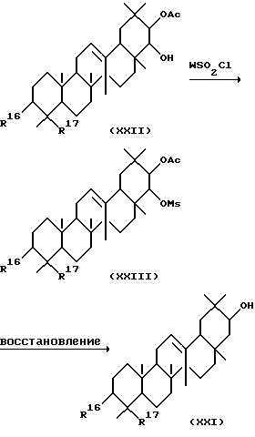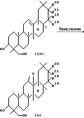 0.89 (3H, s), 0.91 (3H, s), 0.94 (3H, s), 0.95 (3H, s), 0.95 (3H, s), 1.13 (3H, s), 1.25 (3H, s), 0.82-2.18 (20H, m), 2.41 (1H, br s), 2.73 (1H, br s), 2.90 (1H, d, J = 4.0 Hz), 3.32-3.46 (3H, m), 3.46 (3H, s), 4.21 (1H, d, J = 11.1 Hz), 5.22 (1H, t-like)MC ЭИ (м/з): 488 (М+) Пример 25 3 , 24 (4 )- Бензилидендиокси-21,22-диоксоолеан-12-ен (соединение 34) 3 – 24 , Бензилидендиокси-22-диоксоолеан-12-ен-21 ол (соединение 35)Оксалилхлорид (0,15 мл) растворяли в 4 мл дихлорметана и раствор охлаждали до -78oC. Раствор 0,25 мл ДМСО в 1 мл дихлорметана добавляли к охлажденному раствору и смесь перемешивали в течение 10 мин. К реакционному раствору по каплям добавляли раствор 200 мг соединения 23 в 4 мл дихлорметана и смесь перемешивали при -78oC в течение 15 мин. К реакционному раствору добавляли 0,74 мл триэтиламина и смесь перемешивали при -78oC в течение 5 мин. Температура реакционного раствора постепенно повышалась до 0oC. К нему добавляли воду и смесь экстрагировали дихлорметаном, и экстракт промывали насыщенным водным раствором соли и сушили над сульфатом магния. Неорганическую соль удаляли фильтрованием, фильтрат концентрировали при пониженном давлении до получения концентрата, который затем очищали путем колоночной хроматографии на силикагеле (проявляющая система, дихлорметан) с получением 76 мг (выход: 37%) соединения 34 и 30 мг (выход: 15%) соединения 35 в виде желтого твердого вещества. 1H-ЯМР (CDCl3) м.д. (соединение 34)0.98 (3H, s), 1.09 (3H, s), 1.14 (3H, s), 1.15 (3H, s), 1.16 (3H, s), 1.20 (3H, s), 1.49 (3H, s), 0.90-2.63 (19H, m), 3.62 (1H, d, J = 11.1 Hz), 3.64 (1H, dd,J = 5.3 Hz, 11.4 Hz), 4.29 (1H, d, J = 11.1 Hz), 5.41 (1H, t-like), 5.78 (1H, s), 7.31-7.39 (3H, m), 7.49-7.52 (2H, m) MC ЭИ (м/з): 558 (М+) 1H-ЯМР (CDCl3) м.д. (соединение 35)0.70 (3H, s), 0.97 (3H, s), 1.06 (3H, s), 1.09 (3H, s), 1.12 (3H, s), 1.27 (3H, s), 1.49 (3H, s), 0.91-2.49 (19H, m), 3.60-3.68 (3H, m), 4.19 (1H, d, J = 4.2 Hz), 4,30 (1H, d, J = 11.1 Hz), 5.32 (1H, t- like), 5.79 (1H, s), 7.30-7.40 (3H, m), 7.48-7.52 (2H, m) MC ЭИ (м/з): 560 (M+) Пример 26 21,22-Диоксоолеан-12-ен-3 , 24 (4 )- диол (соединение 36)Соединение 34 (25 мг) растворяли в 1 мл дихлорметана и 2 мл метанола, к раствору добавляли 0,5 мл 1 N соляной кислоты и смесь перемешивали при комнатной температуре в течение 4 часов. Реакционный раствор разбавляли дихлорметаном, промывали водой и сушили над сульфатом магния. Неорганическую соль удаляли фильтрованием и фильтрат концентрировали при пониженном давлении до получения концентрата, который затем очищали путем колоночной хроматографии на силикагеле (проявляющая система, н-гексан: этилацетат =1:1) с получением 12 мг (выход: 59%) соединения 36 в виде бесцветного твердого вещества. 1H-ЯМР (CDCl3) м.д. (соединение 34)0.91 (3H, s), 0.94 (3H, s), 1.13 (3H, s), 1.14 (3H, s), 1.15 (3H, s), 1.18 (3H, s), 1.25 (3H, s), 0.80-2.75 (21H, m), 3.32-3.39 (1H, m), 3.41-3.49 (1H, m), 4.21 (1H, d, J = 11.0 Hz), 5.40 (1H, t-like) MC FAB (м/з): 471 (M+H)+ Пример 21 22-Оксоолеан-12-ен-3 , 21 , 24 (4 )- триол (соединение 37)Соединение 35 (25 мг) растворяли в 1 мл дихлорметана и 2 мл метанола, к раствору добавляли 0,5 мл 1 N соляной кислоты и смесь перемешивали при комнатной температуре в течение 4 часов. Реакционный раствор разбавляли дихлорметаном, промывали водой и сушили над сульфатом магния. Неорганическую соль удаляли фильтрованием и фильтрат концентрировали при пониженном давлении до получения концентрата, который затем очищали путем колоночной хроматографии на силикагеле (проявляющая система, н-гексан: этилацетат =1:1) с получением 13 мг (выход:61%) соединения 37 в виде бесцветного твердого вещества. 1H-ЯМР (CDCl3) м.д.
