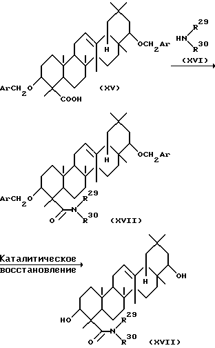 Способ (Е)Среди соединений, представленных формулой (IV), соединение, представленное формулой (XVIII), может быть получено с помощью следующей методики. ![]() Сначала соединение, представленное формулой (XV), где Ar представляет арил, реагирует с соединением, представленным формулой (XVI), где R29 и R30 определены выше, в присутствии соответствующего конденсирующего агента с получением соединения, представленного формулой (XVII), где Ar, R29 и R30 определены выше. Растворители, используемые при этом, включают, например, дихлорметан, хлороформ, бензол, толуол, тетрагидрофуран и диметилформамид. Конденсирующие агенты, используемые при этом, включают, дициклогексилкарбодиимид (ДЦК), ДЦК-гидроксибензотриазол, бензотриазол-1-илокситрис (диметиламино)-фосфония гексафторфосфат (реагент БОФ) и дифенилфосфорилазид. Конденсирующий агент может использоваться в количестве от 1 до 3 эквивалентов в расчете на количество соединения, представленное формулой (XV). Обычно реакция может проводиться при температуре от -20 до 60oC. Соединение, представленное формулой (XVII), может быть каталитически восстановлено в присутствии катализатора с получением соединения, представленного формулой (XVIII). Растворители, используемые при этом, включают, например, воду, метанол, этанол, тетрагидрофуран, диоксан, дихлорметан и хлороформ. Катализаторы, используемые при этом, включают, например, Pd-C, Pd(OH)2-C. Катализатор может использоваться в количестве от 0,1 до 0,6 эквивалента в расчете на количество вещества, представленного формулой (XVII). Обычно реакция может проводиться при комнатной температуре в атмосфере водорода при давлении от 1 до 4 атм. Гидроксильная группа соединения, представленного формулой (XVII), может быть далее модифицирована с получением соединения, представленного формулой (IV). Соединение, представленное формулой (XV), может быть получено с помощью следующей методики. ![]() Соединение, представленное формулой (XVa), может реагировать с соединением, представленным формулой (XVb), в присутствии основания с последующим удалением защиты триарильной группы с получением соединения, представленного формулой (XVc), где Ar представляет арильную группу. Растворители, используемые при этом, включают диэтиловый эфир, ТГФ, ДМФ, диметилсульфоксид (ДМСО), бензол и толуол. Основания, используемые при этом, включают, например, гидрид натрия, гидрид калия, н-бутиллитий, NaCH2SOCH3 и трет-ВиОК. Предпочтительно, основание и соединение, представленное формулой (XVb), используются в количестве от 1 до 10 эквивалентов в расчете на количество соединения, представленного формулой (XVa). Предпочтительно, реакция проводится при температуре от -78 до 60oC. Удаление защиты может производиться в присутствии минеральной кислоты, такой как соляная кислота или серная кислота, в растворителе, таком как метанол, этанол, изопропиловый спирт (ИПС) или вода, при температуре от 0 до 80oC. Соединение, представленное формулой (XVc), можно затем окислить с помощью соответствующего окисляющего вещества с получением соединения, представленного формулой (XVd). Окисляющие агенты, используемые при этом, включают, например, пиридиния хромат, пиридиния дихромат, диоксид марганца и ДМСО окисляющие реагенты, такие как ДМСО-оксалилхлорид. Растворители, используемые в этой реакции, включают дихлорметан, хлороформ, диэтиловый эфир и ТГФ. Предпочтительн