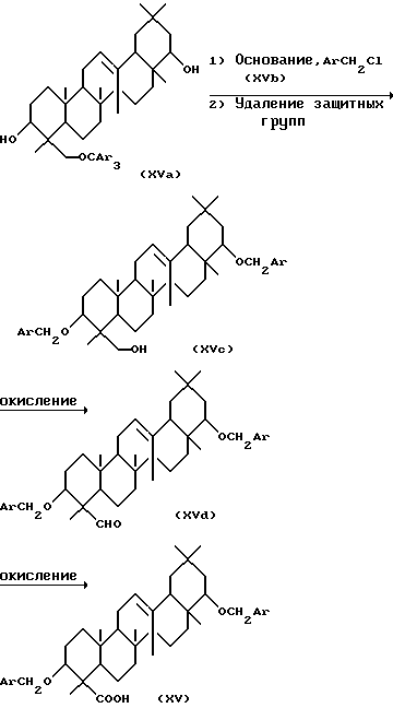 0.88 (3H, s), 0.89 (3H, s), 0.93 (3H, s), 0.94 (3H, s), 1.05 (3H, s), 1.11 (3H, s), 1.21 (3H, s), 0.85-2.18 (22H, m), 3.07-3.08 (1H, m), 3.18-3.24 (2H, m), 4.16 (1H, d, J = 10,5 Hz), 4,32 (1H, d, J = 11.7 Hz), 4.39 (1H, d, J = 11.7 Hz), 4.62 (1H, d, J = 11.7 Hz), 4.67 (1H, d, J = 11.7 Hz), 5.22 (1H, t-like), 7.26-7.34 (10H, m)MC SIMS [МСВИ] (м/з): 639 (M++1) Пример 10 3 , 22 -Дибензилокси-24(4 )-оксолеан-12-ен (соединение 14)Оксалилхлорид (0,15 мл) растворяли в 4 мл метиленхлорида и раствор охлаждали до -7oC. К охлажденному раствору добавляли раствор 0,23 мл ДМСО в метиленхлориде и смесь перемешивали в течение 10 мин. К полученному таким образом реакционному раствору добавляли раствор 128 мг соединения 13 в 2 мл метиленхлорида и смесь перемешивали при -78oC в течение 15 мин. К реакционному раствору добавляли 0,7 мл триэтиламина и смесь перемешивали при -78oC в течение 5 мин. Температура реакционного раствора постепенно повышалась до 0oC. Реакционный раствор разбавляли водой, экстрагировали метиленхлоридом, промывали насыщенным гидрокарбонатом натрия и сушили над безводным сульфатом магния. Неорганическую соль удаляли фильтрованием, фильтрат концентрировали при пониженном давлении и полученное в результате масло очищали путем колоночной хроматографии на силикагеле (проявляющая система, н-гексан: этилацетат = 10: 1) с получением 104 мг (выход: 82%) соединения 14 в виде бесцветного пенообразного вещества. 1H-ЯМР (CDCl3) м.д.