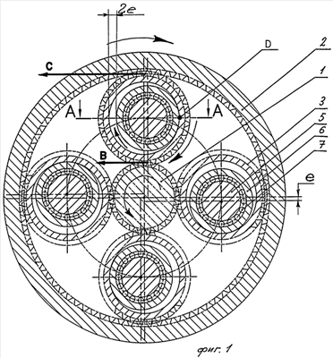 Подшипники 6 установлены концентрично с шипами 5 водила 4. При этом наружный диаметр подшипников 6 (наружного кольца подшипника) меньше внутреннего диаметра шестерни сателлита 3 на удвоенную величину заданного эксцентриситета «е». За счет этого зазора при взаимодействии шестерен передачи (при любом направлении вращения шестерен) шипы 5 вместе с подшипниками 6 оказываются установленными эксцентрично относительно сателлитов 3, то есть оси шипов 5 смещены относительно осей сателлитов 3 на величину заданного эксцентриситета «е».