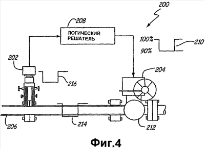 Фиг. 4 – это пример схемы автоматической системы 200 безопасности, в которой датчик 202 давления и клапанное устройство 204 управления соединены с системой трубопроводов 206. Логический решатель 208 сконфигурирован, чтобы подавать сигнал 210 на клапанное устройство 204 управления, чтобы вызывать частичное изменение позиции клапана 212. Это вызывает изменение 214 давления в системе трубопроводов 206, результирующее изменение 216 в выходном сигнале от датчика давления 202.