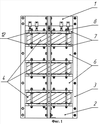 Верхний торцевой элемент 1 оснащен элементами опрессовки 8. Торцевые элементы 1 и 2 расположены сверху и снизу трехфазной конструкции реактора, их концы зафиксированы между боковыми конструкционными элементами 3, образуя вертикальную трехфазную конструкцию реактора.