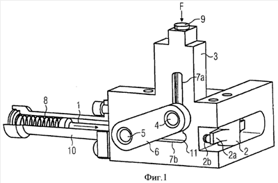 Далее корпус 3 содержит первую и вторую направляющие 7а, 7b. Направляющие 7а, 7b введены в корпус 3 в виде сквозных щелевых траекторий. Первая направляющая 7а придана в соответствие верхнему опорному элементу 4. Вторая направляющая 7b придана в соответствие нижнему опорному элементу 5. Опорные элементы 4, 5 скользят соответственно в одной из направляющих 7а, 7b. Направляющие 7а, 7b при этом расположены относительно друг друга таким образом, что они стоят перпендикулярно друг на друге. Щели, которые образуют направляющие 7а, 7b, касаются друг друга в форме L. Направляющие однако могут также быть выполненными отдельно друг от друга. Посредством направляющих 7а, 7b установлены проходящие вдоль прямых траекторий движения для опорных элементов 4, 5. Опорные элементы 4, 5 расположены на расстоянии относительно друг друга. Они выполнены соответственно в виде валков и выступают из плоскости корпуса 3. Для фиксирования расстояния опорных элементов 4, 5 относительно друг друга применен связующий элемент 6. Связующий элемент 6 выполнен в виде планки, которая расположена параллельно к плоскости, из которой выдаются опорные элементы 4, 5. Предпочтительным образом на скрытой стороне представленного на Фигуре 1 примера выполнения может быть предусмотрено подобное выполнение связующего элемента, так что обеспечено симметричное прохождение опорных элементов 4, 5. Опорные элементы 4, 5 могут быть связаны со связующим элементом 6 с возможностью вращения. За счет этого трение при движении опорных элементов 4, 5 в направляющих 7а, 7b может уменьшаться. Нажимной элемент 9 является выполненным в виде штыря, причем продольная ось штыря направлена параллельно к первой направляющей 7а таким образом, что штырь 9 заходит в первую направляющую 7а и может вступать в соединение с верхним опорным элементом 4, чтобы оказывать силу давления F на верхний опорный элемент 4.