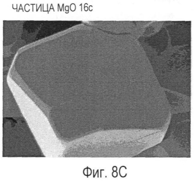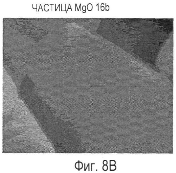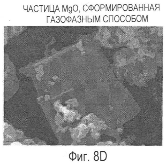 Предшественник MgO, обожженный при температуре, находящейся в интервале от 700°C до 2000°C включительно, образует частицы MgO 16a-16d с двумя или тремя характерными кристаллографическими плоскостями. В другом эксперименте, выполненном авторами изобретения, наблюдалось, что грань кристалла с кристаллографической ориентацией (110) имеет тенденцию к сокращению, когда предшественник обжигают при температуре примерно 1500°C или выше. Соответственно, чтобы увеличить выход частиц MgO 16c и 16d, имеющих три характерные кристаллографические плоскости, температура обжига предпочтительно должна находиться в интервале от 700°C до температуры не выше 1500°C. С другой стороны, чтобы увеличить выход частиц MgO 16a и 16b, температура обжига желательно должна находиться в интервале от 1500°C до 2000°C включительно.