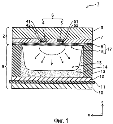 Переднюю панель 2 и заднюю панель 9 соединяют вместе и герметизируют при использовании стеклянного припоя. После этого внутреннее разрядное пространство 15 вакуумируют до высокой степени вакуума (1,0×10-4 Па), удаляя посредством этого атмосферный воздух и газообразные примеси из разрядного пространства 15. В разрядном пространстве 15 размещают в качестве разрядного газа ксеноновую газовую смесь, например газ на базе Ne-Xe, газ на базе He-Ne-Xe или газ на базе Ne-Xe-Ar, при заданном давлении (66,5 кПа-101 кПа в этом варианте осуществления). Концентрация газообразного Xe в такой газовой смеси находится в интервале от 15% до 100%.
