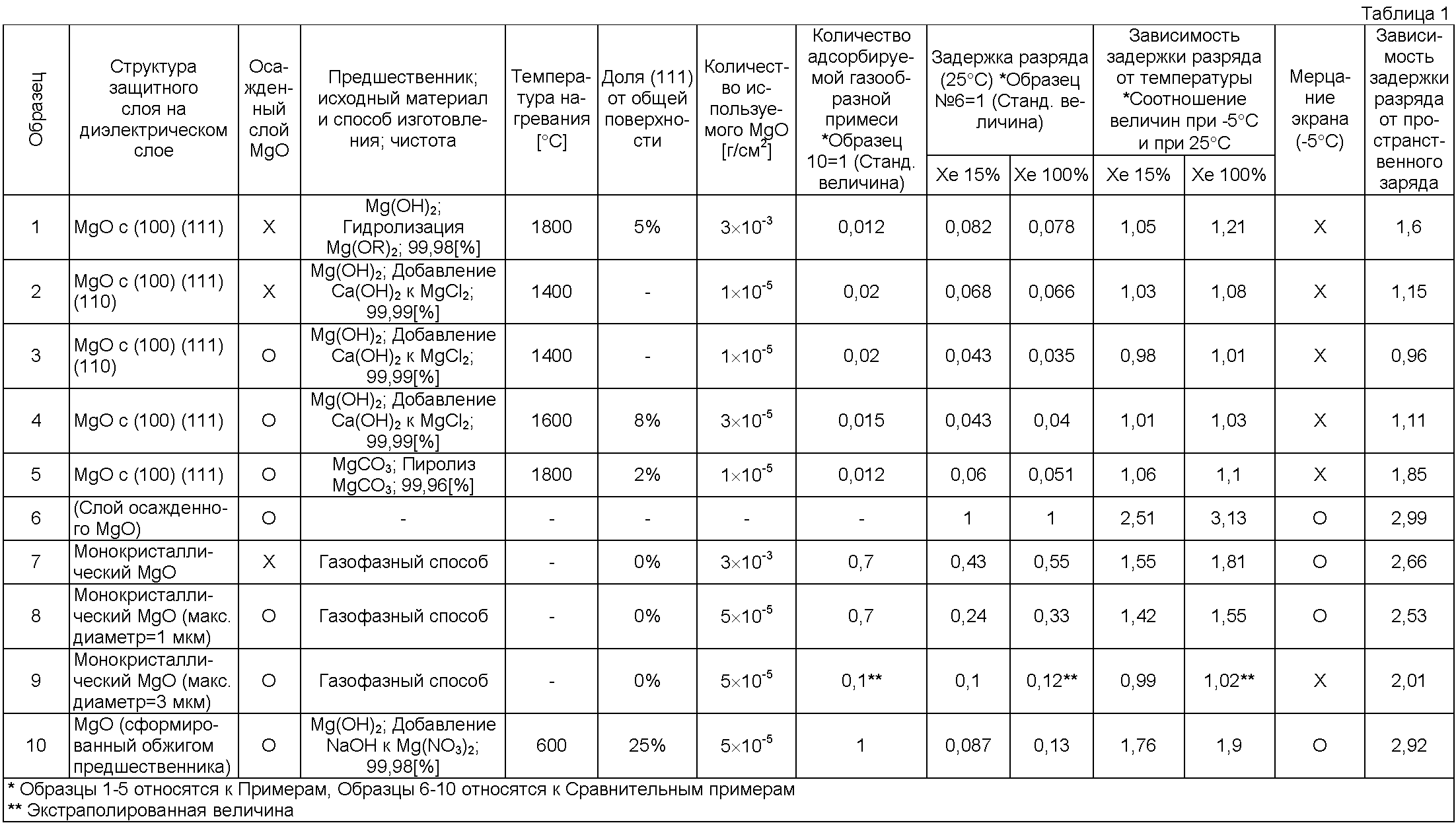 Следует заметить, что в Образцах 1-5 частицы MgO, используемые для образования защитного слоя, формируют обжигом высокочистого предшественника оксида магния при температуре выше 700°C (1400°C-1800°C). При использовании такого способа в Примерах могут быть получены частицы MgO большего размера с меньшим числом дефектов кристалла, чем в Сравнительных примерах. При использовании частиц MgO с такой структурой высокого качества Образцы 1-5 достигают указанных выше свойств.