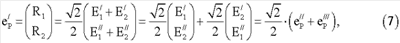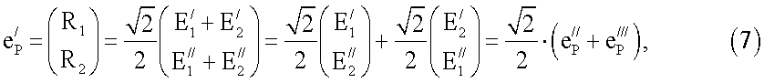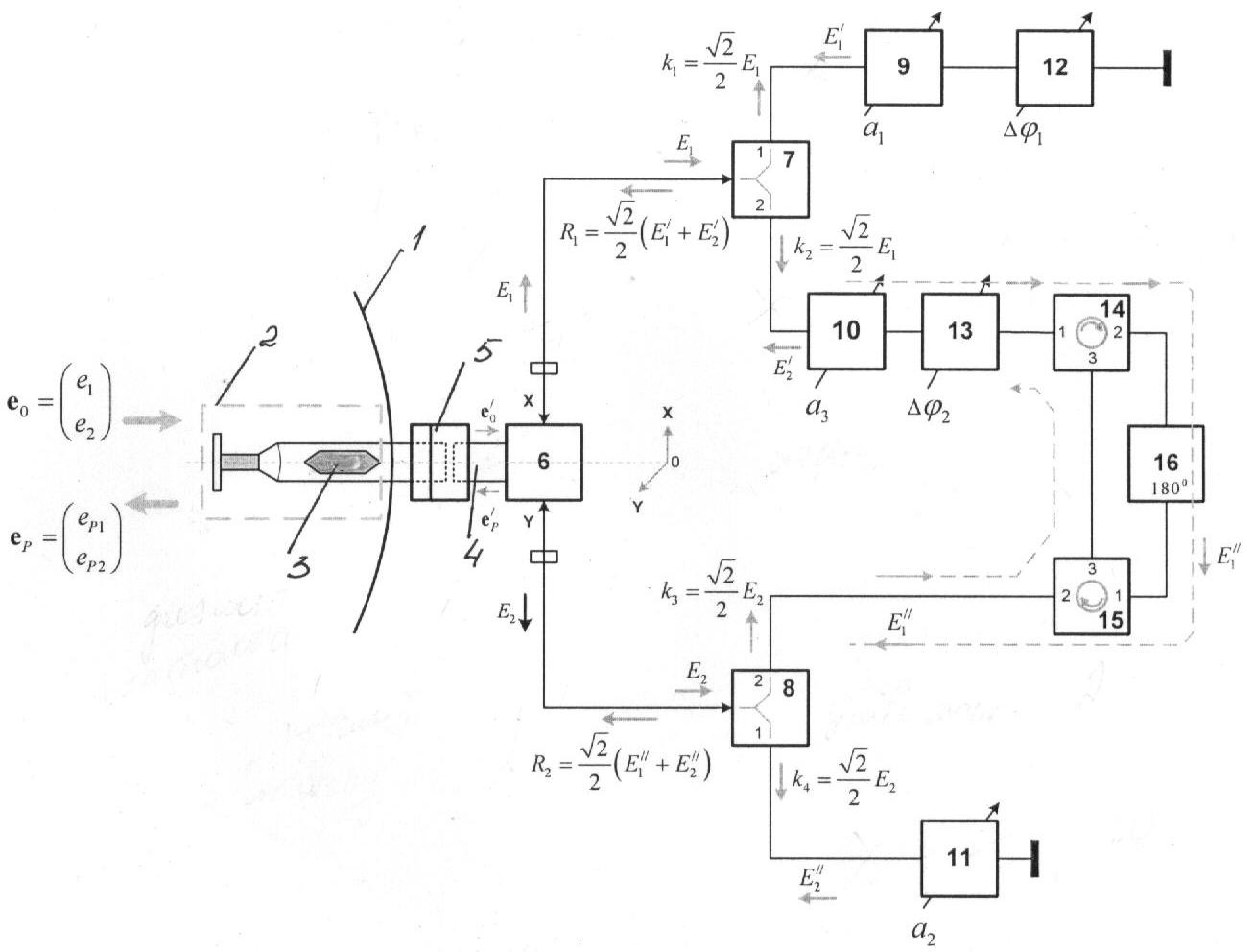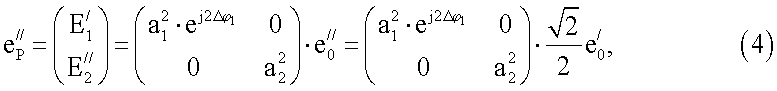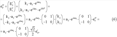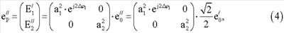 где F – оператор пропускания четвертьволновой диэлектрической пластинки 3, ориентированной под углом по отношению к оси 0Х системы координат, образованной осями плеч поляризационного разделителя 6. Поле возбуждает на выходах плеч поляризационного разделителя 6 два сигнала Е1 и E2. Эти сигналы, поскольку они распространяются в независимых каналах х и у плеч поляризационного разделителя 6, можно записать в виде вектора