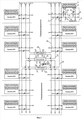Каждый из каналов 4К панелей излучателей 1 соединен с соответствующим выходом одного из 4К блоков фазовращателей 2, входы которых соединены с соответствующими выходами волноводных Н-мостов 6, одни из входов которых соединены с направленными ответвителями 7, объединенными магистральными волноводами 4, а другие – магистральными волноводами 5. При этом в ответвленных каналах (в которые СВЧ-энергия ответвляется) направленных ответвителей 7, объединенных магистральными волноводами 5, установлены фазовыравнивающие секции 8, а в каналах направленности (в которые СВЧ-энергия не поступает) всех направленных ответвителей 7 установлены согласованные нагрузки 9. Входы магистральных волноводов 4 и 5 соединены, соответственно, с выходами основных линеек направленных ответвителей 10 и вторых дополнительных линеек направленных ответвителей 12, при этом каналы направленности основных линеек НО 10 соединены через фазирующие секции 13 с выходами дополнительных линеек НО 11. Входы основных линеек НО 10, дополнительных линеек НО 11 и вторых дополнительных линеек НО 12 соединены, соответственно, с выходами первого СВЧ-сумматора 14, суммирующего устройства 15 и второго СВЧ-сумматора 18, при этом входы первого СВЧ-сумматора 14 и суммирующего устройства 15, по которым формировались разностные диаграммы направленности в плоскости расположения главного распределителя, соединены через фазирующую секцию 17 с направленным ответвителем 16.