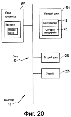 Обращаясь к чертежам, на которых аналогичные цифровые обозначения относятся к подобным или идентичным частям на нескольких представлениях (видах), и более конкретно, к Фиг. 20, заметим, что на ней показана система 10 организации телеконференций. Система 10 содержит сеть 40. Система 10 содержит узел 207 с контентом, имеющим контент и адрес в сети 40, и находящийся в связи с сетью 40. Система 10 содержит первый пользовательский узел 201 и второй пользовательский узел 203, находящиеся в связи друг с другом через сеть 40, чтобы сформировать конференцию. Первый пользовательский узел 201 способен обеспечивать адрес узла 207 с контентом через сеть 40 к первому и второму узлам, так что первый и второй узлы могут оба обращаться к контенту узла 207 с контентом в течение конференции.
